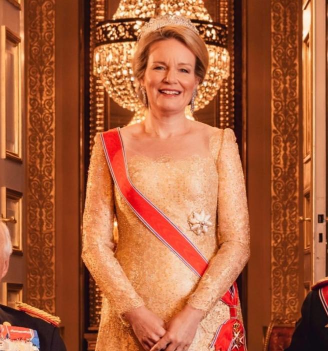 由于王后身份自带贵族光环,所以50+的玛蒂尔德走在奥斯陆王宫成为焦点;她还佩戴红色绶带,选择的皇冠与礼服裙一样闪耀,全新造型确实瞩目。