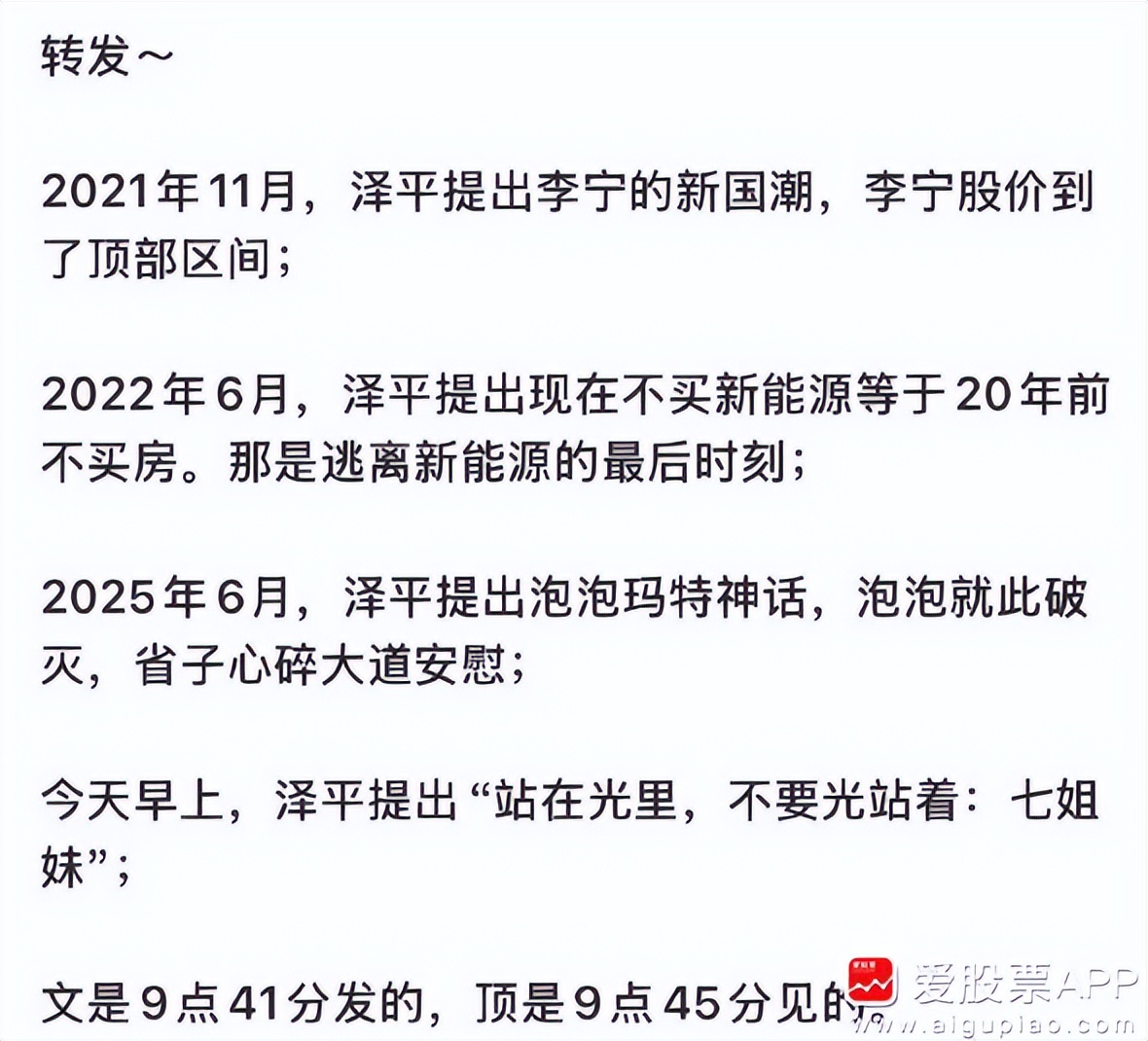 任泽平吹光。今天任泽平强调站在光里,吹创业板七姐妹了!然后光就跌了,这嘴真是开过光的。
