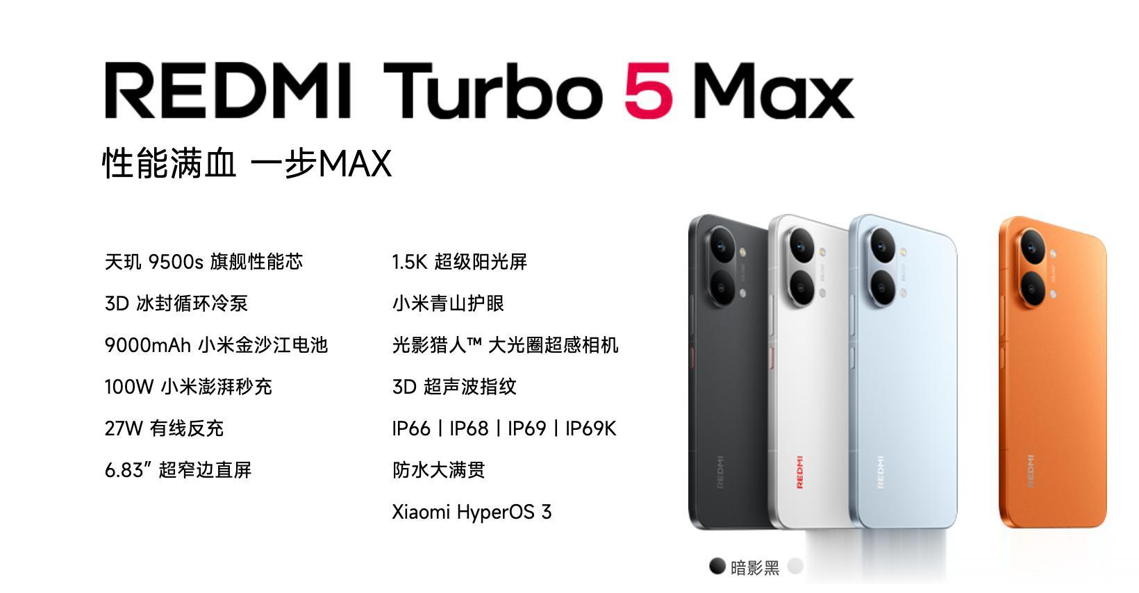 闭眼选红米Turbo 5Max另外,K15Pro+的天玑9500s机型正好有一个竞品,那就是红米Turbo 5Max,这款手机也是9500s处理器,并且还是9000毫安大电池,再加上6.83英寸的M10基材1.5K屏,一样有3D指纹解锁,还有1115F双扬,也是100W快充带充电头版本,目前小米还没有调价,我们看看它的价格: