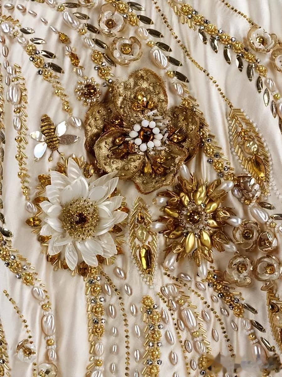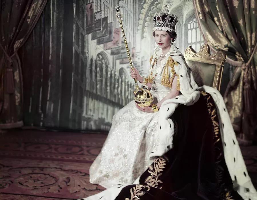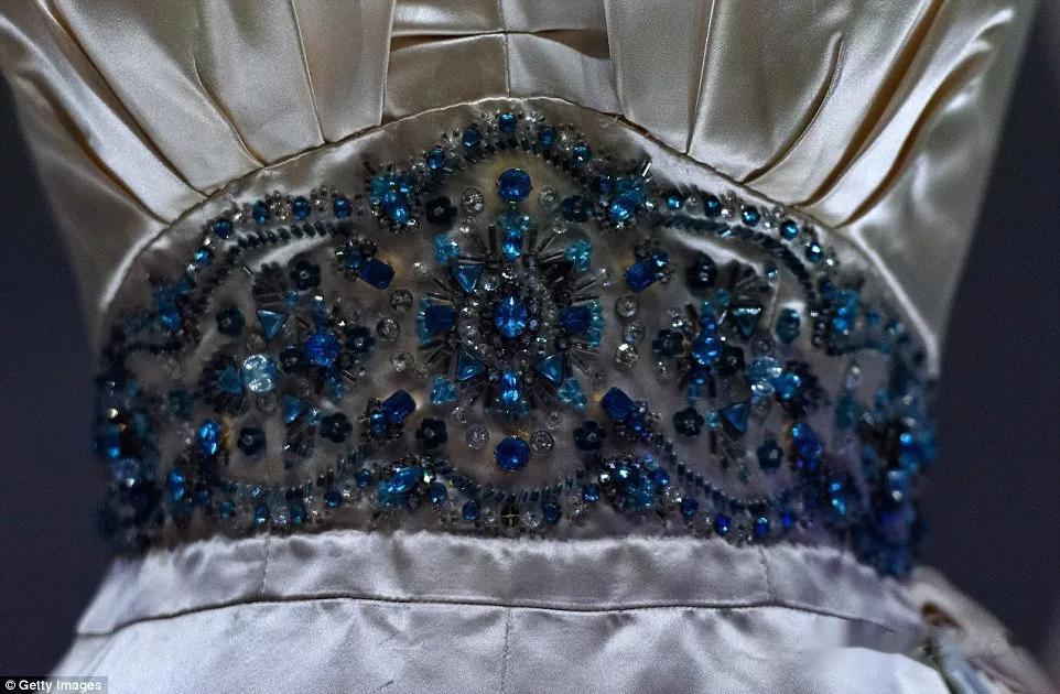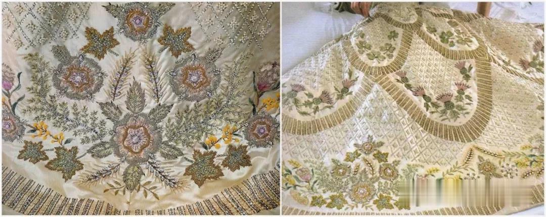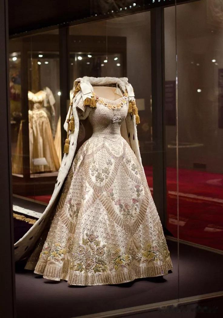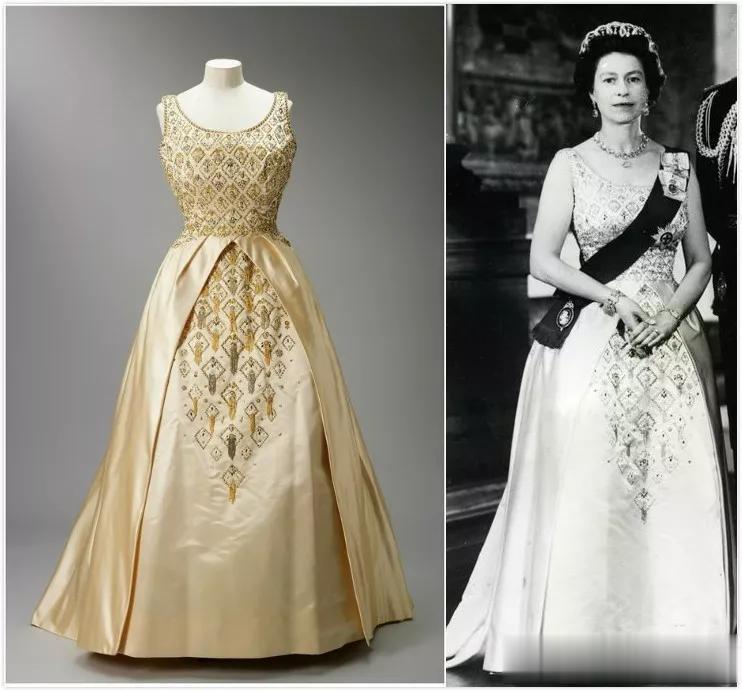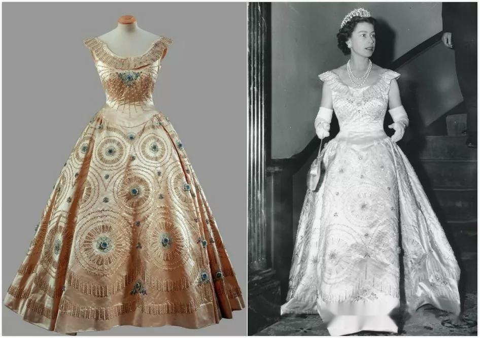 加冕这么重要的场合自然要尽善尽美,据说伊丽莎白要求诺曼将所有能象征英属领土的植物刺绣在裙子上:都铎玫瑰象征英国本土,蓟象征苏格兰,韭葱象征威尔士,三叶草象征爱尔兰,合欢花象征澳大利亚,枫叶象征加拿大,羊齿蕨象征新西兰,帝王花象征南非,荷花象征印度和锡兰(今斯里兰卡),以及象征着巴基斯坦的小麦、棉花和黄麻