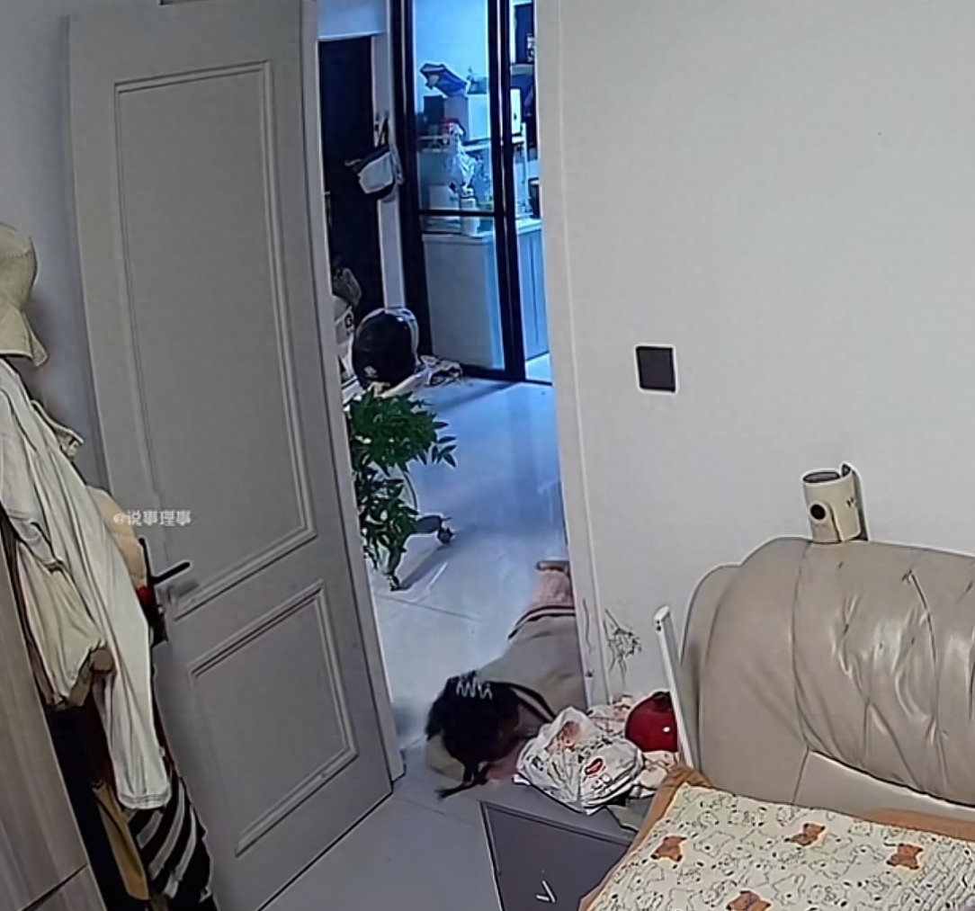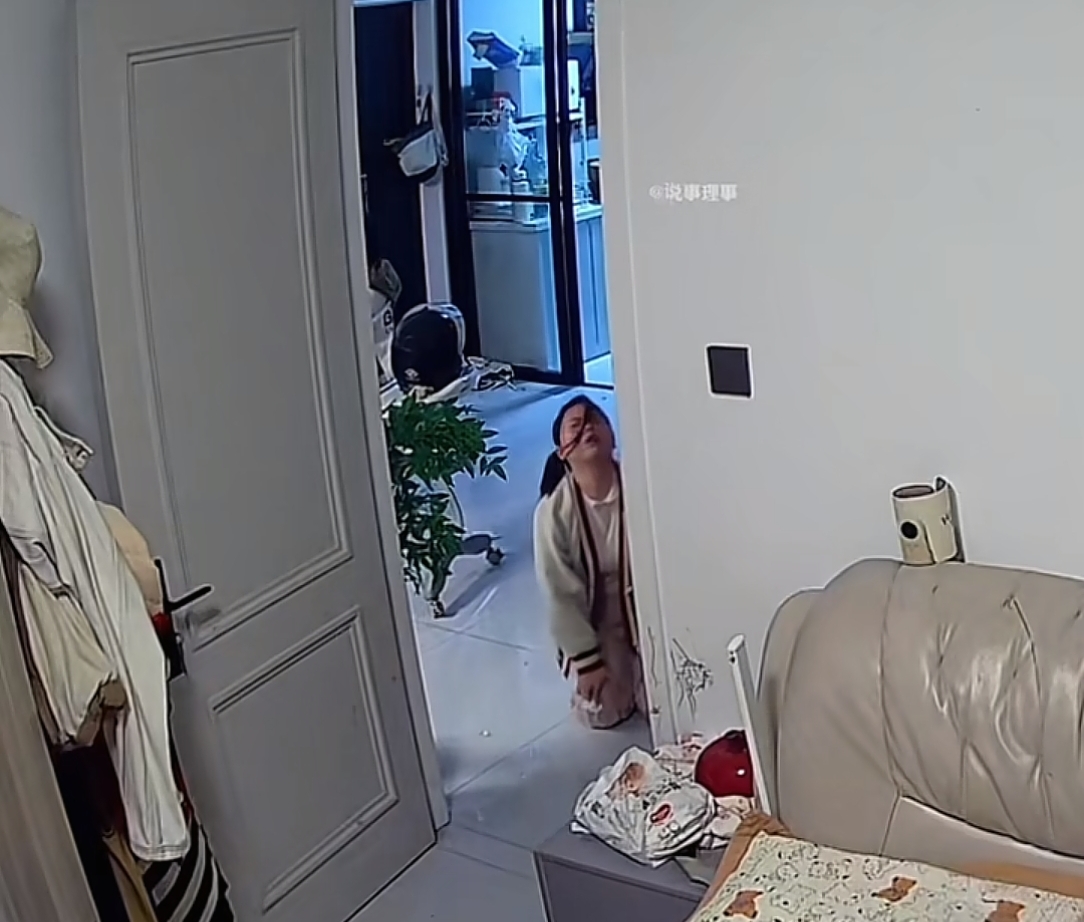 视频中,女子在厨房洗完奶瓶后准备走进卧室时,就在走到门框位置时突然身体不适,随即重重摔倒在地!