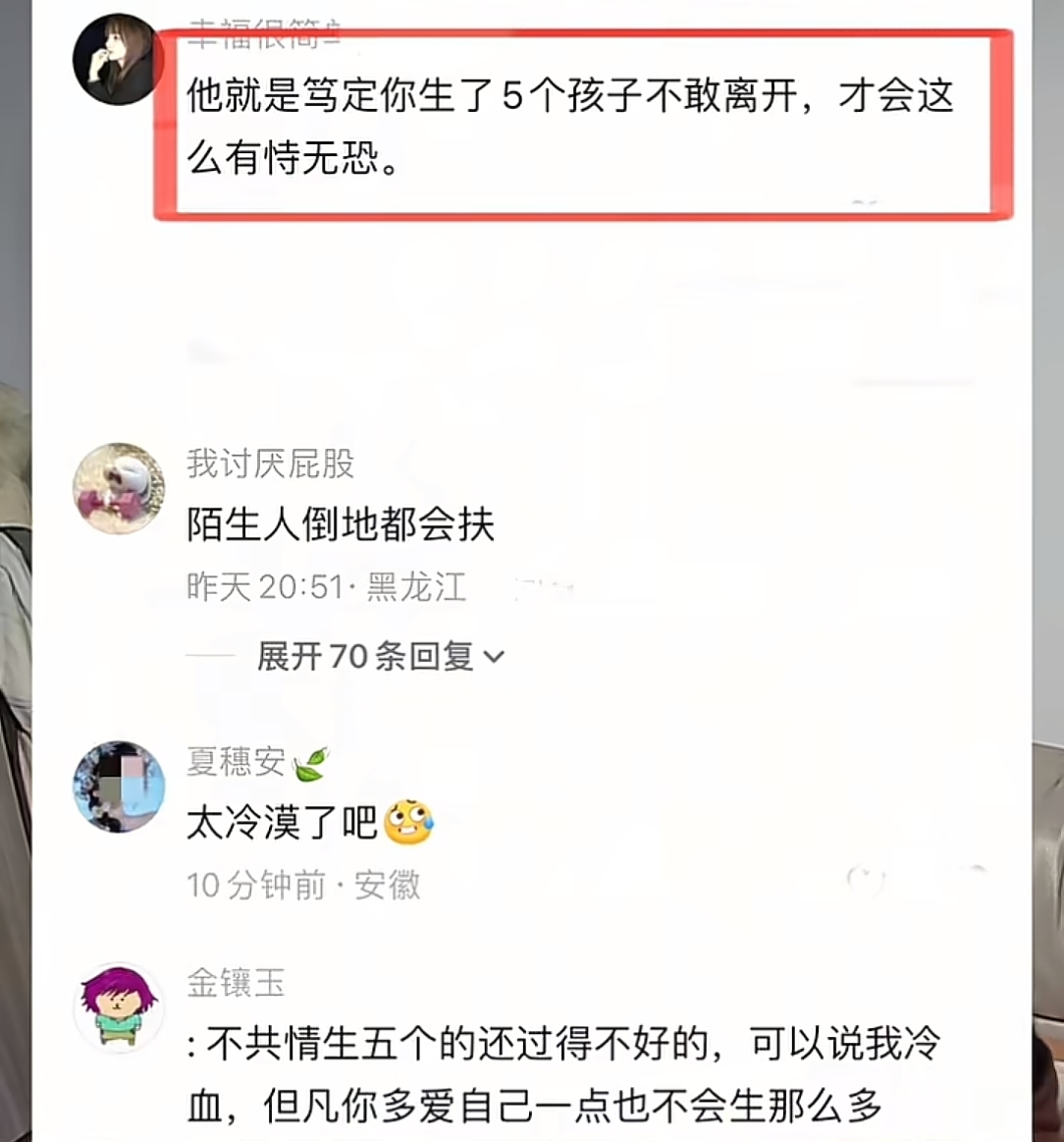 生五个孩子,真的很佩服这个女人,两人应该是感情非常好才会生这么多吧?也有网友认为,是不是两人之间发生了什么,丈夫才会变得如此冷漠的?