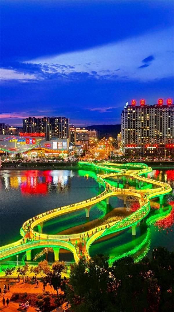 布尔哈通河两岸霓虹连绵,彩虹桥、滨河云廊倒影如画;延大网红弹幕墙朝汉双语灯牌流光溢彩,随手出片;海兰明珠塔、恐龙王国灯光秀与沿河夜市相映,越夜越热闹。