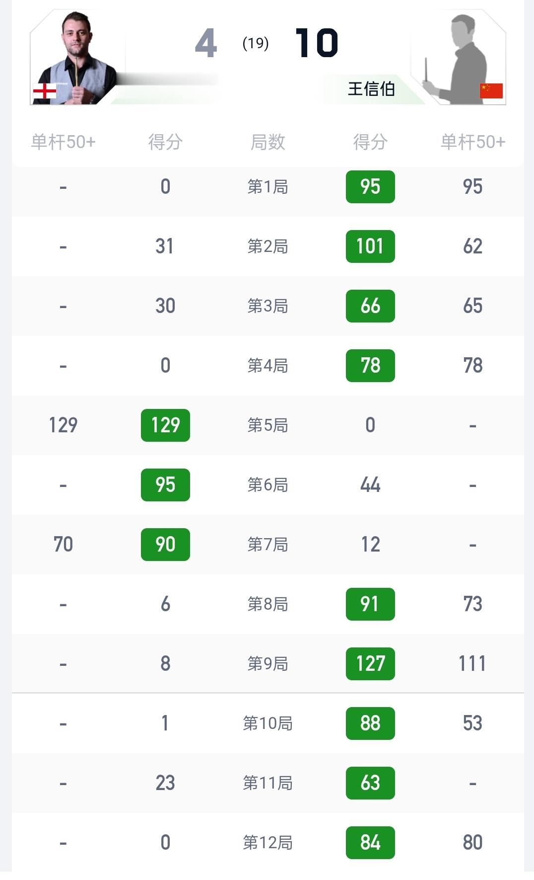 第二阶段,第10局,王信伯打出单杆53总分88拿下,第11局,王信伯打出总分63拿下第12局,王信伯打出单杆80拿下,第13局,米切尔曼打出单杆95扳回一局,第14局,王信伯率先进攻打到51分底袋红球没打进,出现漏球了,王信伯多次进攻拿到77分拿下总比分10-4战胜米切尔曼晋级第二轮比赛,