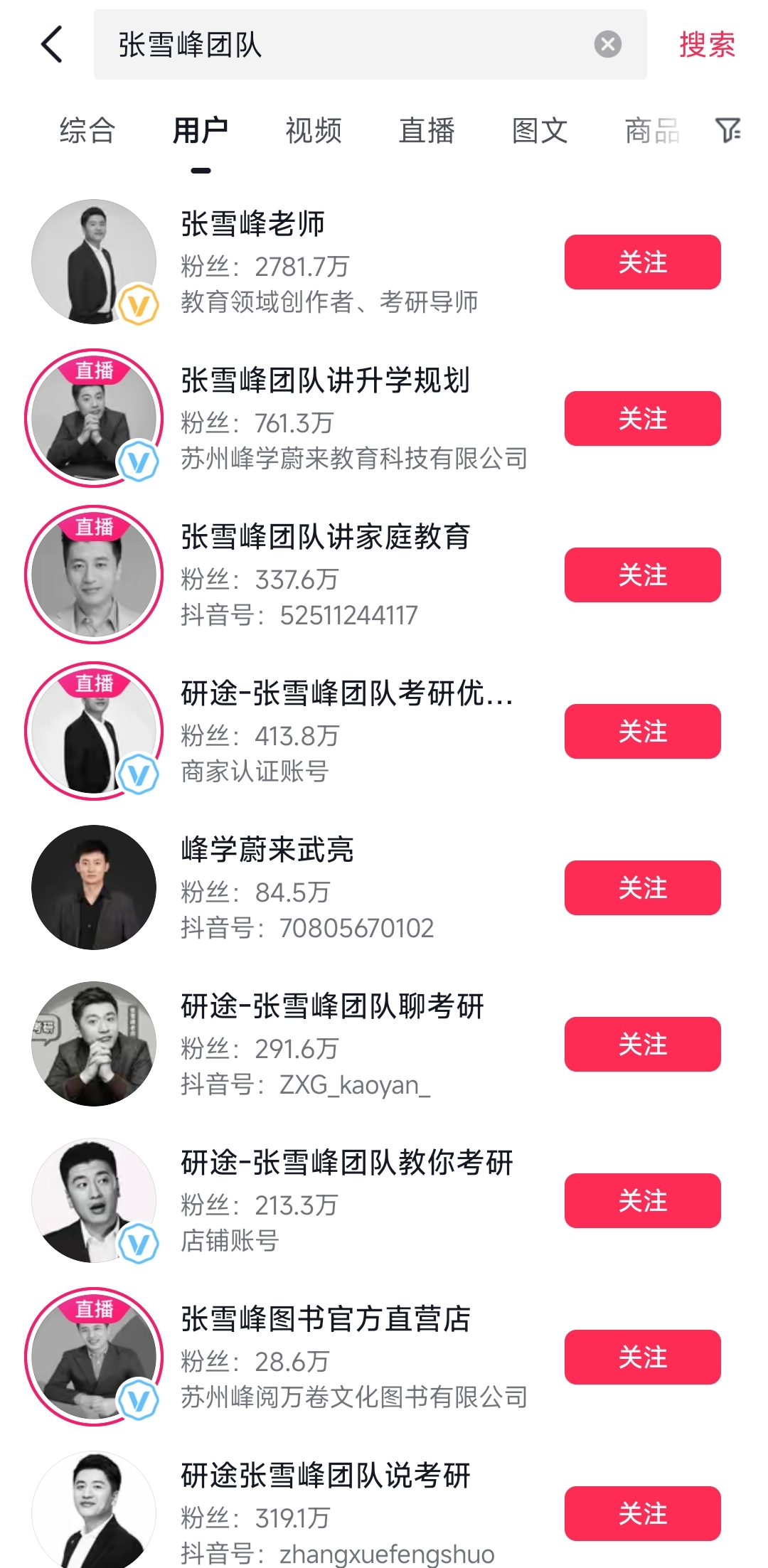 和张雪峰相关的几个直播间,随便点进去一个,人数都在几千人左右。