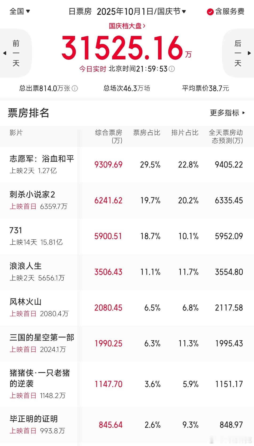 国庆档电影今日新片晚上继续全部维持倒挂,被731截爆了。檀健次的震耳欲聋真有机会