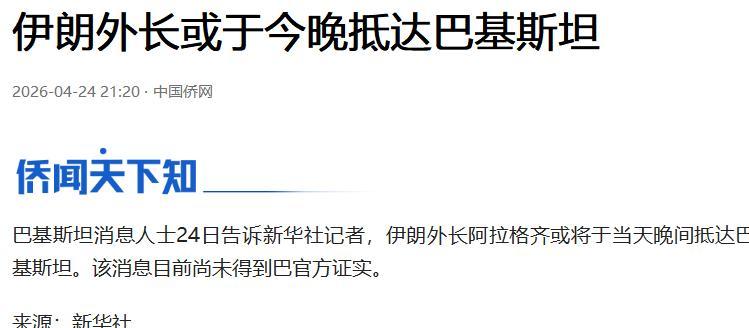 4 月 24 日,伊朗外长阿拉格奇率团抵达巴基斯坦首都伊斯兰堡。伊方称此行将到访巴、阿曼、俄罗斯三国,但外界心知肚明。