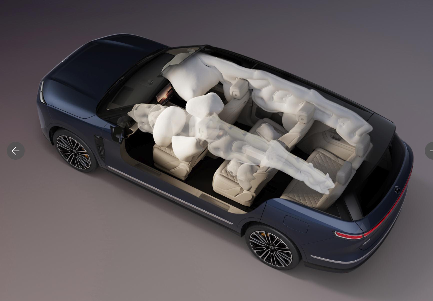 硬件的底子很扎实。车身采用超高强度笼式结构,整车扭转刚度达到40136N·m/deg。全系标配11个安全气囊,气囊总体积达到474L,为同级较大,其中还包括行业罕有的二排双坐垫气囊,在大角度躺姿下也能提供有效保护。侧气帘长度达到3067mm,同样是同级较长,能覆盖三排所有乘员。