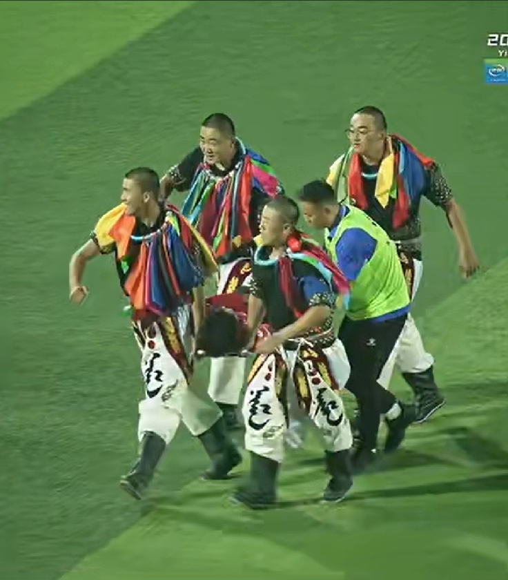 主场的担架队员更有喜感。比赛进行到63分钟时,赤峰队一名球员受伤需要场外医治,谁知进场的是四名身穿盛装的博客手,场边观众爆发出了热烈的掌声,从装束看,这四名博客队员的级别还很高。
