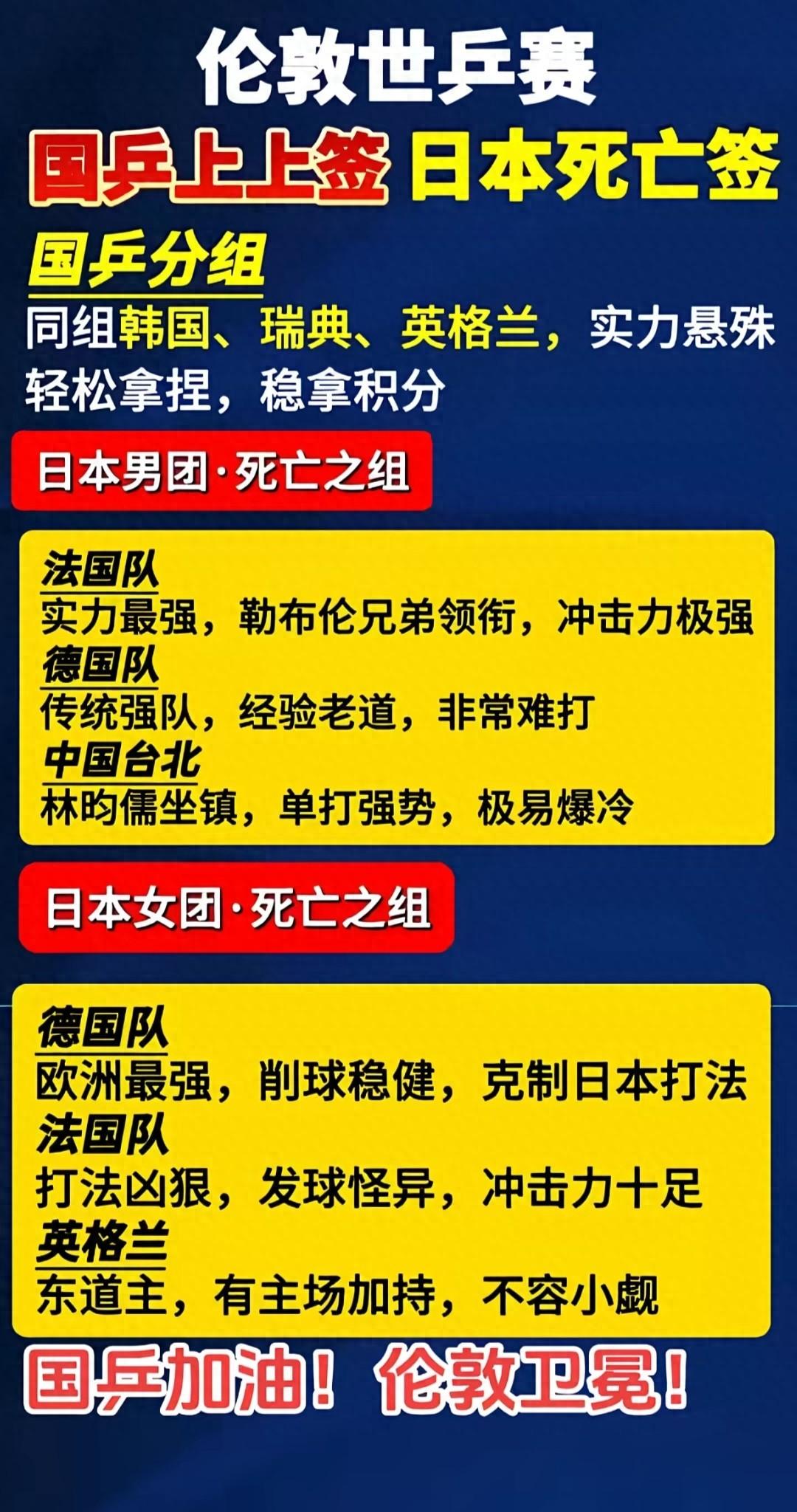 伦敦世乒赛,国乒上上签,同组瑞典、韩国、英格兰,日本死亡签,同组德国和法国。德法日同组,肯定是血雨腥风,不管哪队打到决赛