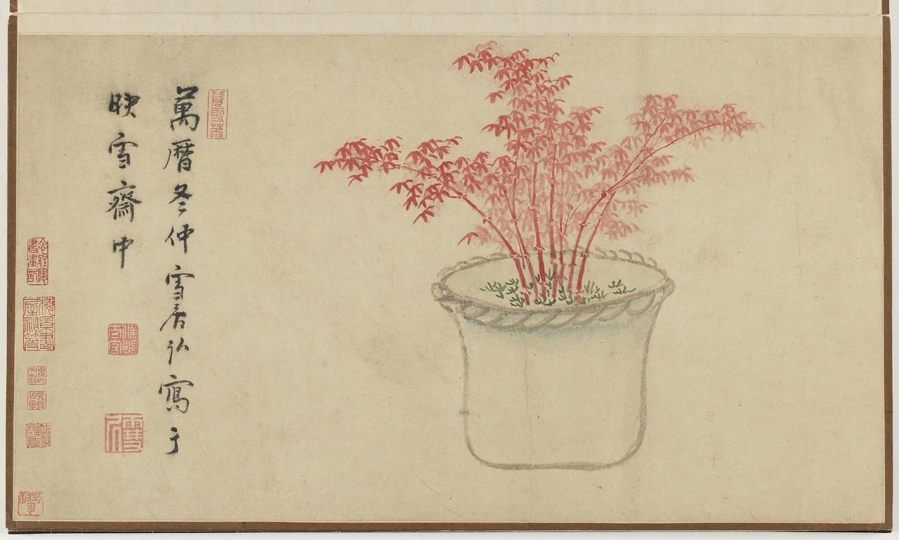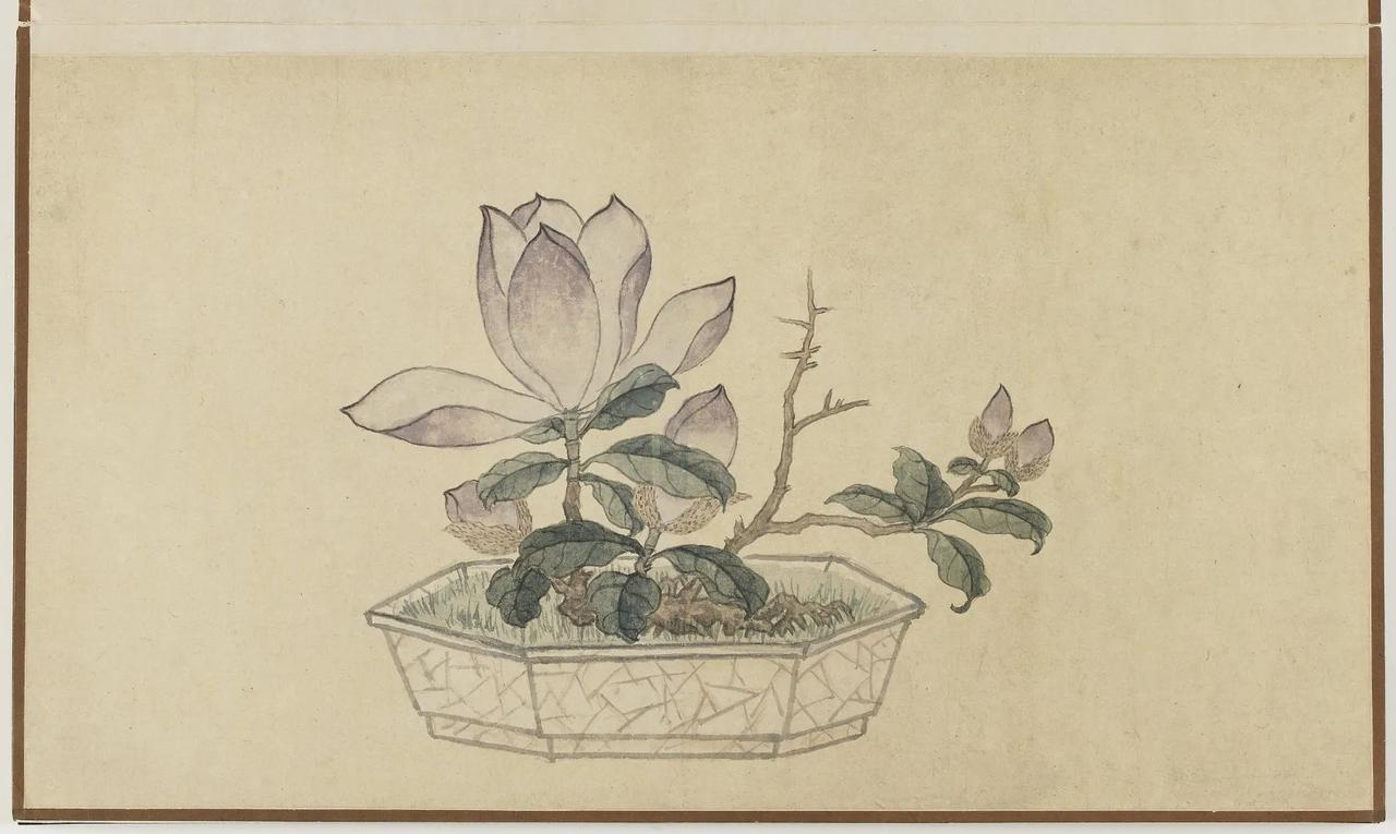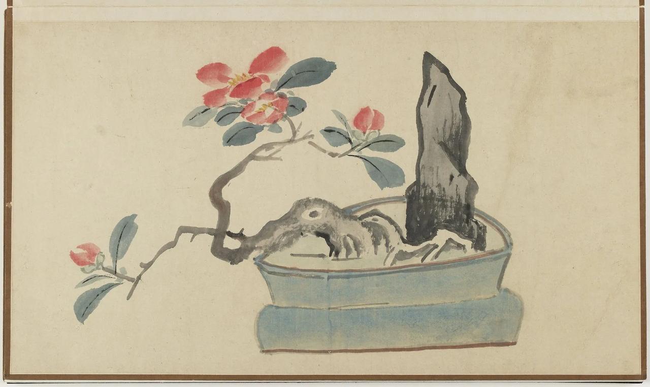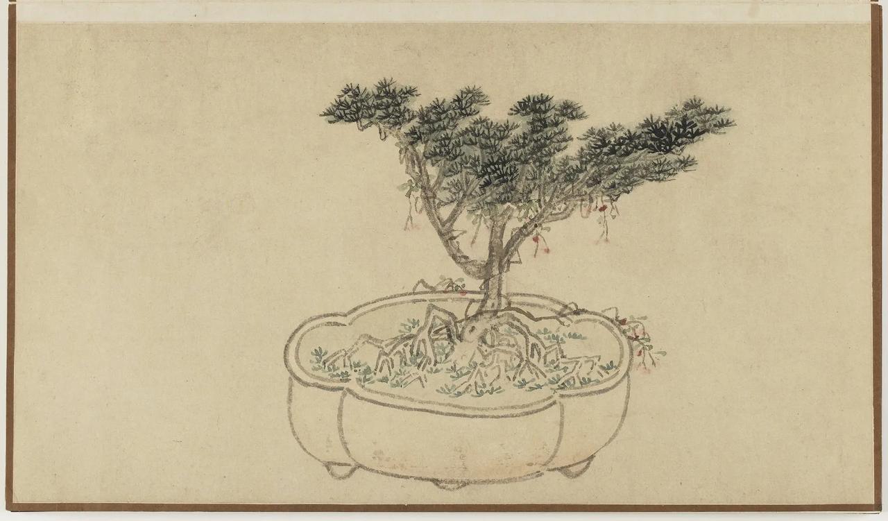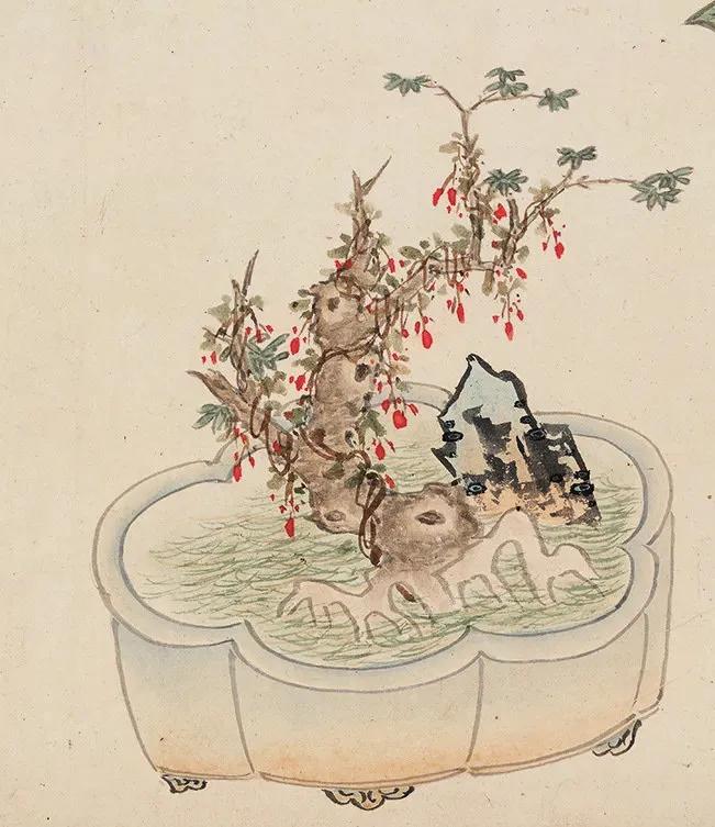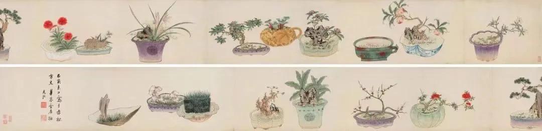 【善画盆景的明代文人画家—孙克弘】 明代文人,特别是姑苏一带,盆景文化非常流行。 《正德姑苏志》中记载就有,虎丘一带的人善于在盆中栽种老松古梅,放在案头,清雅可爱,称作盆景。 孙克弘(1532-1611)明书画家、藏书家,松江(今属上海市)人,善画花鸟,很好客,趣好高古,恋石成癖。他的画中常有描绘盆景的作品出现。 图1 《销闲清课图》 共20段 这一段主题是灌花—浇花 画的正是明代文人在园中打理盆景的情景 明 孙克弘 台北故宫博物院藏 图2-8 《著色盆景花卉卷》 明 孙克弘 1599年作 手卷 设色纸本 30.5×510cm 北京保利2022春季拍卖会 艺林藻鉴——中国古代书画 图9-18 盆花册页(金瘦仙藏本) 明 孙克弘