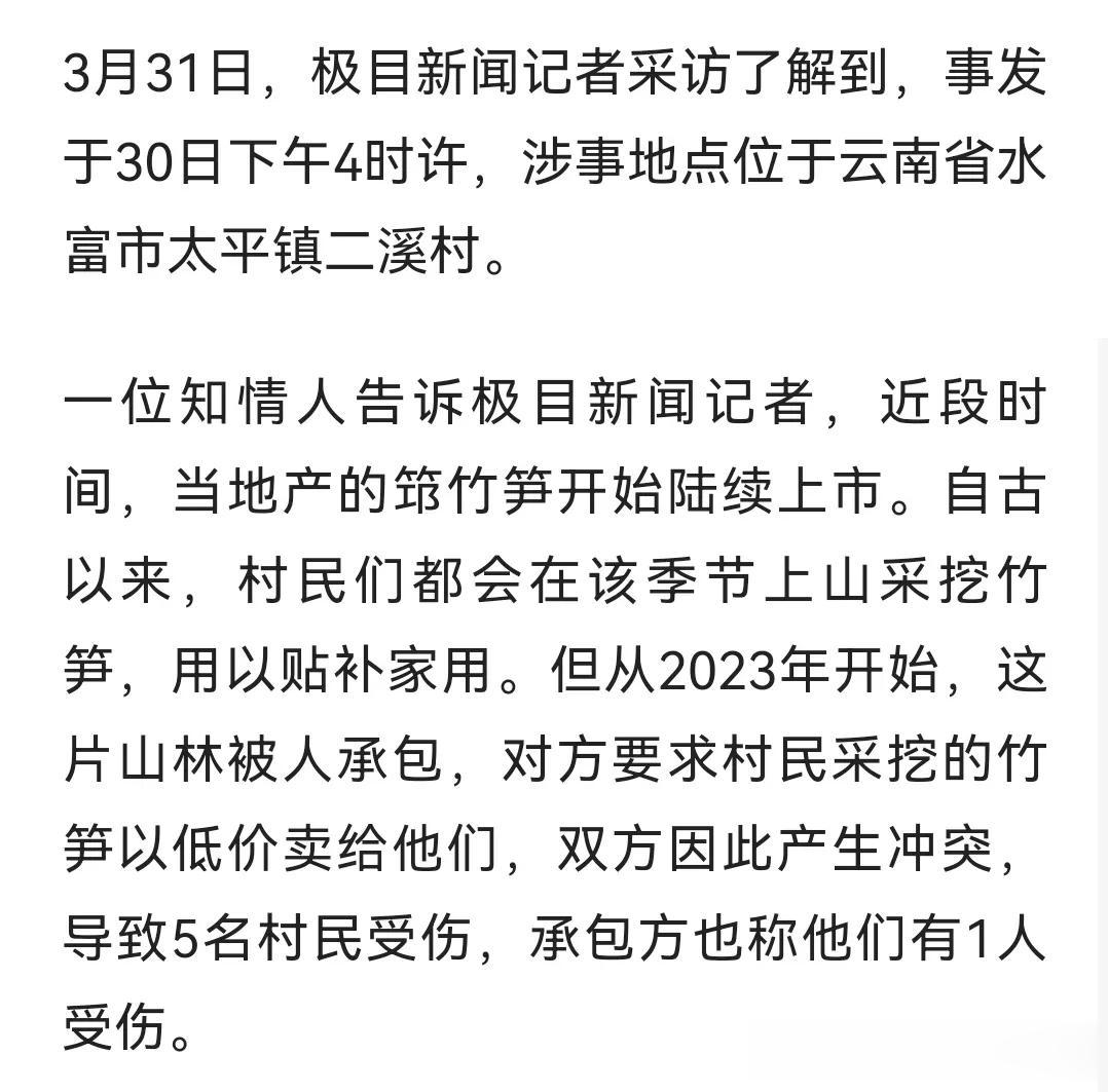 “弯刀伤人”村民上山挖笋承包方发生冲突。重点是“从2023年开始这片山林被承包”,这本是一起村民与承包商的纠纷;一边是村民靠山吃山利用劳动贴补家用,一边又是承包商的利益保障。 云南省水富市太平镇二溪村的这个事件,应该不可能突然发生或者是说完全可以有预见性,毕竟村民又不是只有今年才开始去那片山林挖笋;既然从一开始这件事是完全可以预见,也可以提前解决,比如合理的收购、分成等多种方法。乡镇是否出面了解过、调解过,这样是不是就可以避免这样的事件发生。 还有山林既然被承包出去,是否经过集体表决,还是绕过集体的决定,这就牵扯到村民的知情权和承包费用是否属于集体,是否以分红, 所以在这件事上乡镇村主管单位应该检讨、自检。“挖不挖笋”本来只是纠纷,结果发生了伤人事件,这一下就从纠纷上升到了刑事案件。这对于双方来说都是得不偿失的结果。