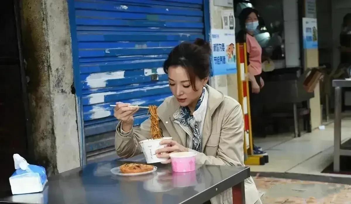 董卿在武汉路边小吃摊上吃热干面,气质优雅,非常接地气。 穿着一身米色风衣,系着蓝色印花丝巾的董卿知性优雅,既文艺又大方,坐在如此简陋的小吃摊前吃面,低调朴实,没有一点架子,真的是太接地气了。