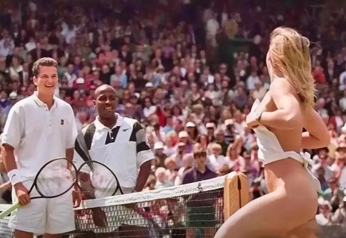 1996年的美国,一场温网网球男单决赛比赛现场,突然一个穿着暴露的姑娘奔跑着出现在了赛场上,正在比赛的两名球员看到这一幕又惊又喜。 当时这个姑娘脱光了衣服出现在赛场时,正在观看比赛的观众们都惊呆了,就连两名比赛选手也目不转睛地盯着飞奔而来的姑娘,一脸惊喜的表情。