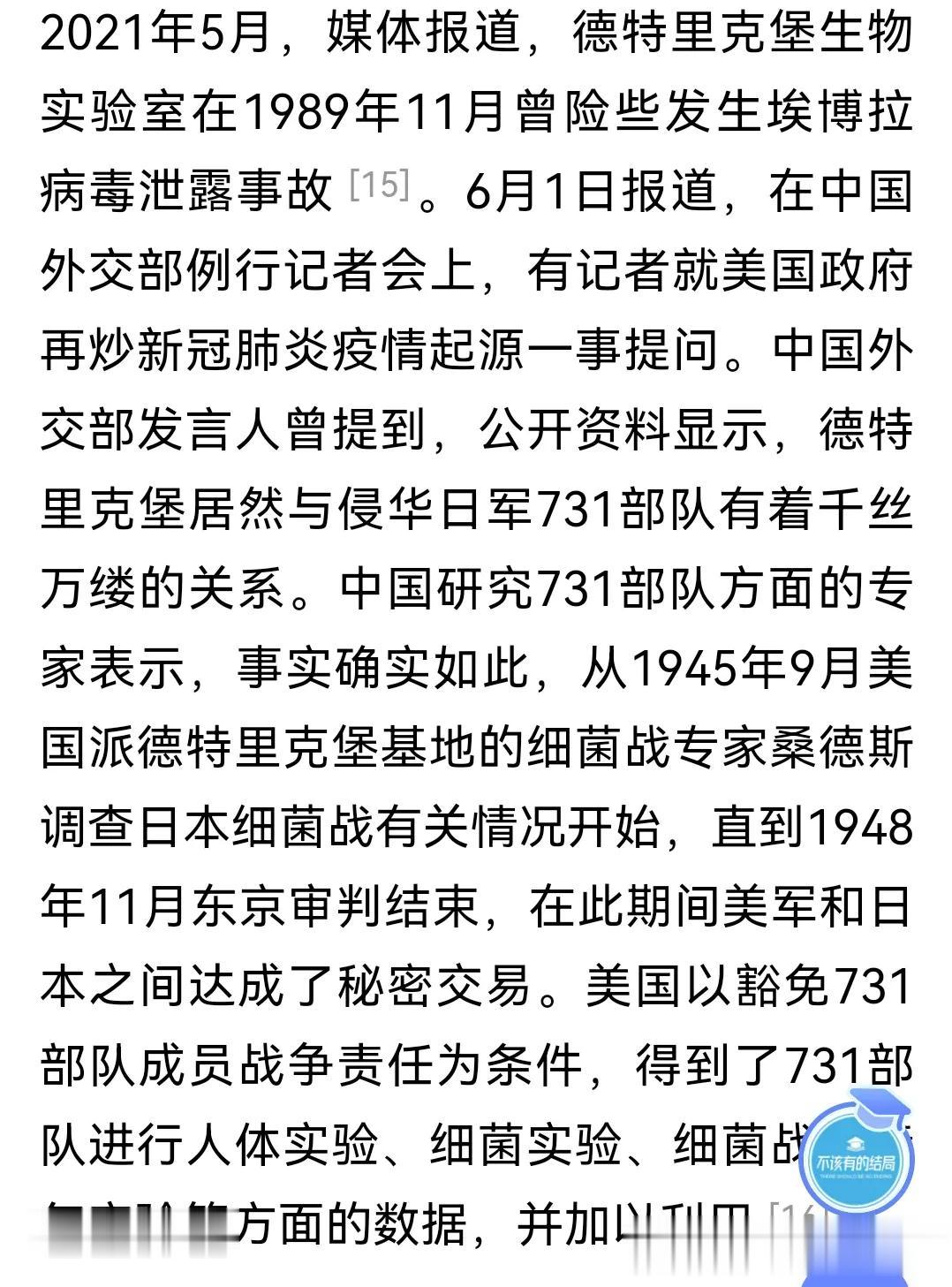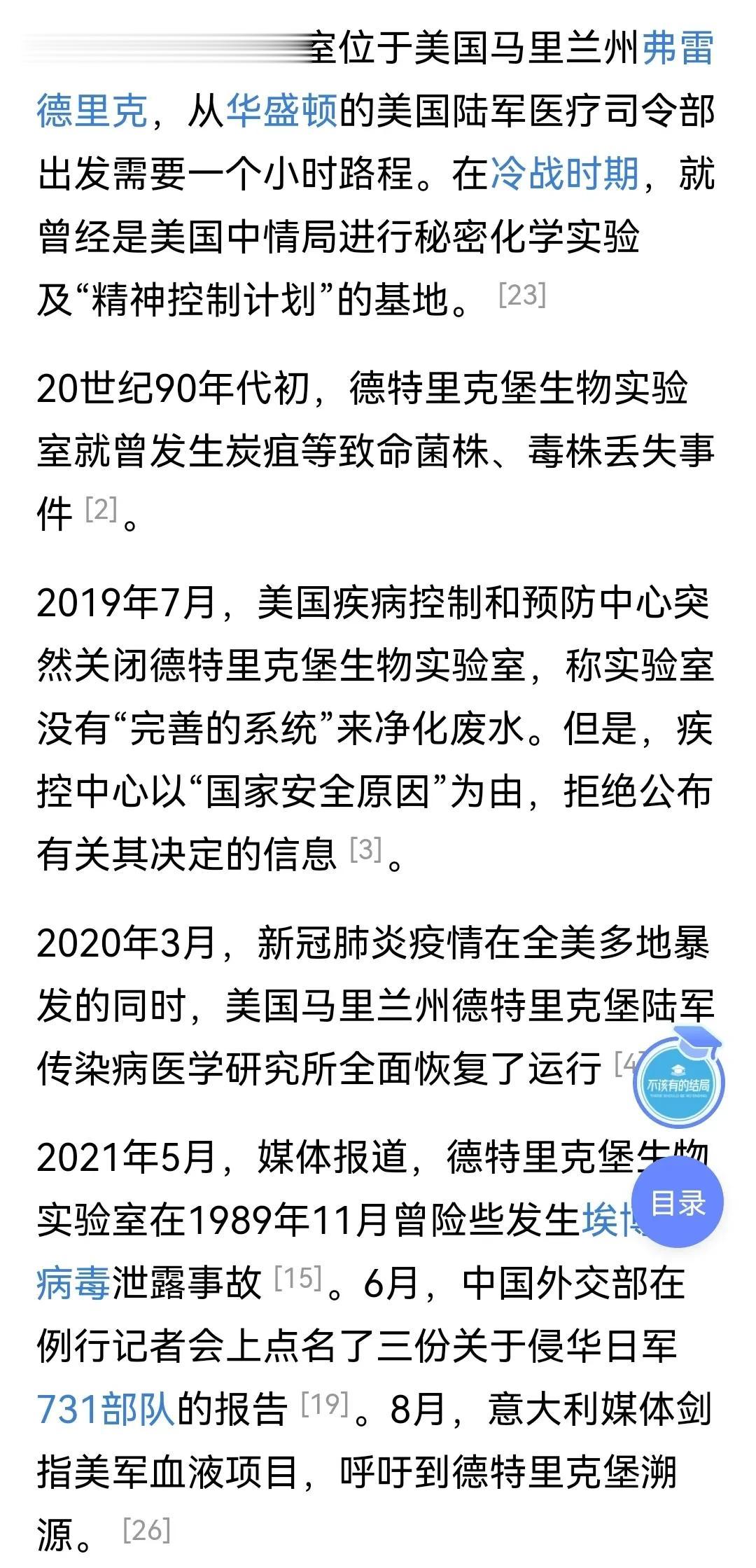 今天下午4点,我国新冠溯源研究情况发布会。新冠溯源的答案也毋庸置疑:源头不在我们。我认为,美国的不解释才是最大的嫌疑,最大的问题! “德特里克堡生物实验室逃逸的猴子” “德特里克堡生物实验室逃逸的猴子” “德特里克堡生物实验室逃逸的猴子” “美国当地媒体最近报道,宾夕法尼亚州一妇女在接触到一只逃逸的实验用猴子后出现了疑似新冠肺炎症状,此事再次引发公众对美国军方生物实验基地德特里克堡的疑虑。 美国长期利用灵长类动物进行冠状病毒研究。《自然》杂志2018年曾披露,德特里克堡的科研人员成功用冠状病毒感染了非洲绿猴。2019年7月,美军德特里克堡生物研究基地出现安全事故,被美疾控中心(CDC)下令临时关闭。随后实验室周边暴发原因不明的呼吸系统疾病。” 德特里克堡实验室位于美国马里兰州弗雷德里克,从华盛顿的美国陆军医疗司令部出发需要一个小时路程。在冷战时期,就曾经是美国中情局进行秘密化学实验及“精神控制计划”的基地