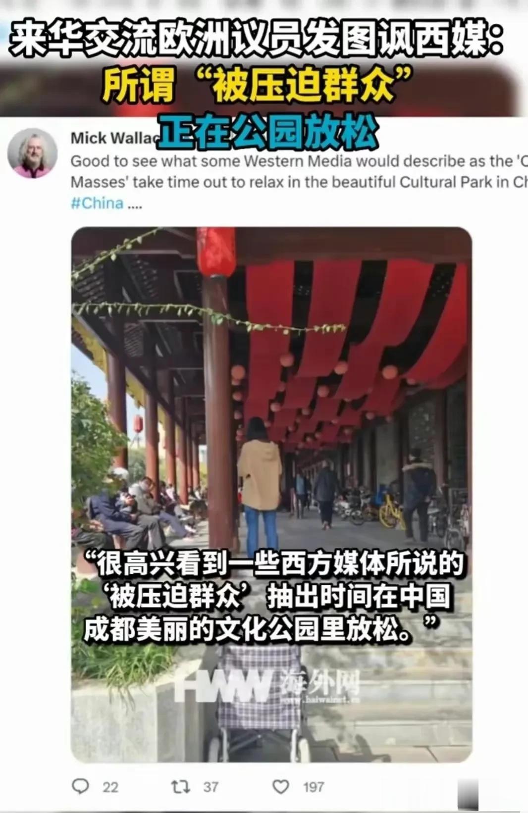 很高兴看到西方媒体所说的“被压迫群众”抽出时间在中国美丽的文化公园里放松”欧洲独立议员华莱士,多年来一直反对西方媒体对中国的不实报道,坚持“欧盟应与中国加强合作而不是对抗”,呼吁欧洲“不要被美国人牵着鼻子走”,曾多次在欧洲议会上反驳美西方的对华政策。 难得欧洲国家还有理性有良知的议员,我们应该好好给予接待,让他们多到中国各地走走看看,更加了解中国;他们给中国说一句话好过我们说一万句,这也是说好中国故事的最佳方法。