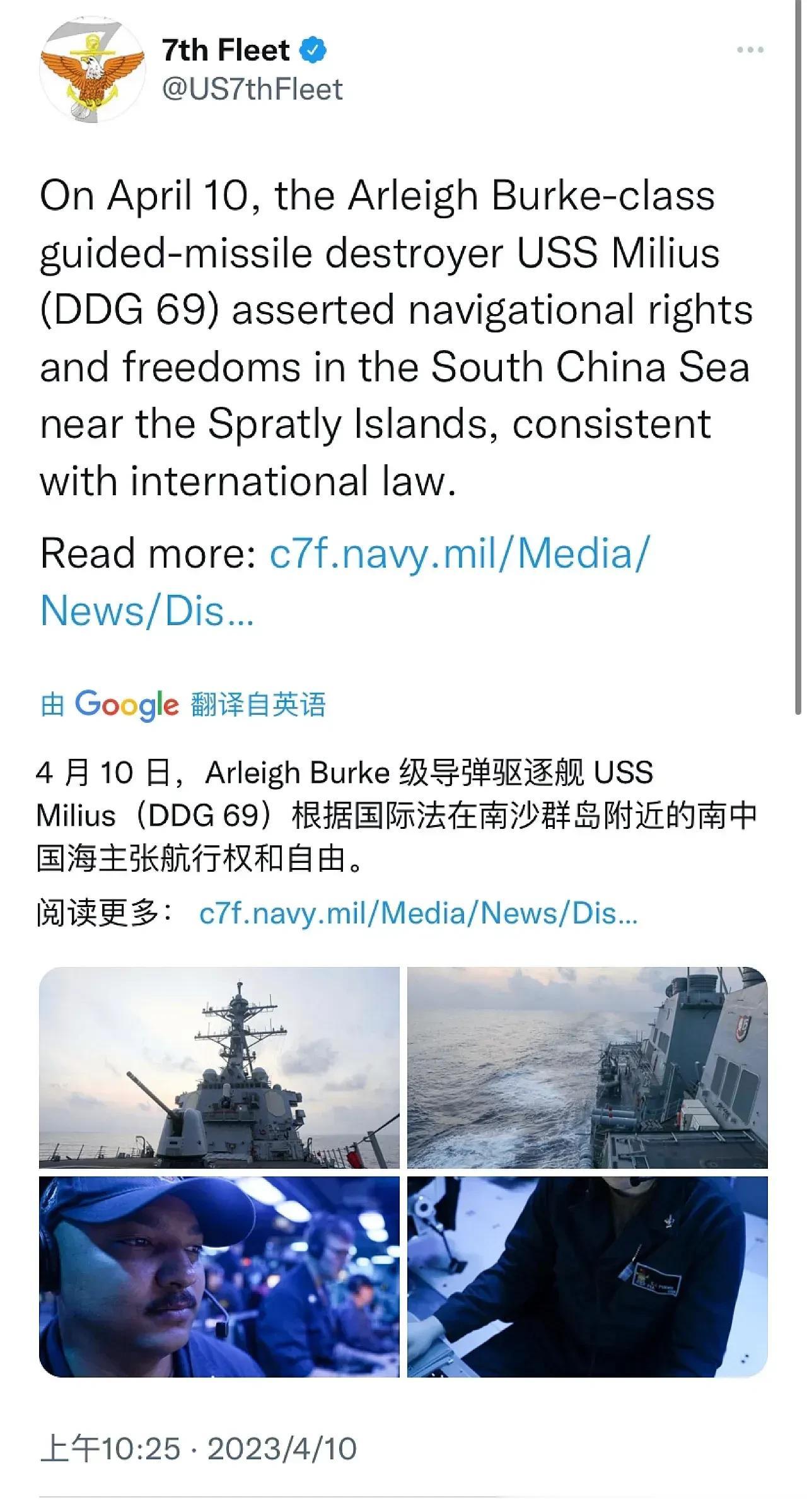 突发新闻:今天(4月10日)美军第七舰队“阿利·伯克”级导弹驱逐舰“米利乌斯”号