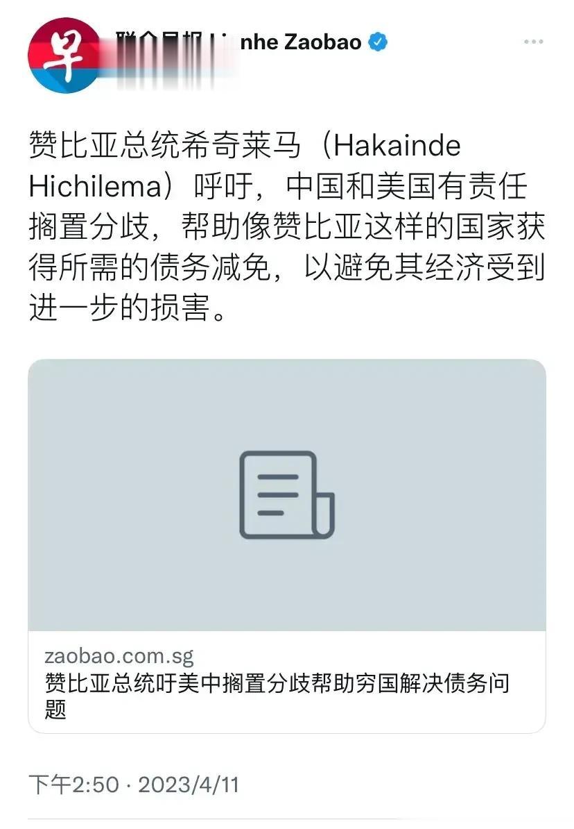 赞比亚总统希奇莱马呼吁,中国和美国有责任搁置分歧,帮助像赞比亚这样的国家获得所需的债务减免,以避免其经济受到进一步的损害。” 学好难,学会易。赞比亚总统希奇莱马,把赖账说的清新脱俗![呆无辜] 中国的援助让他们坐享其成,还觉得你还欠他的,什么逻辑!农夫与蛇的故事又在重演,我们要长记性长记性!