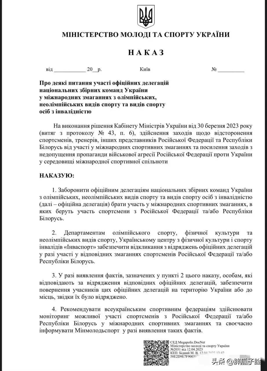 不与敌同行,乌克兰青年和体育部已经发布正式命令,禁止所有乌克兰运动员参加俄罗斯、