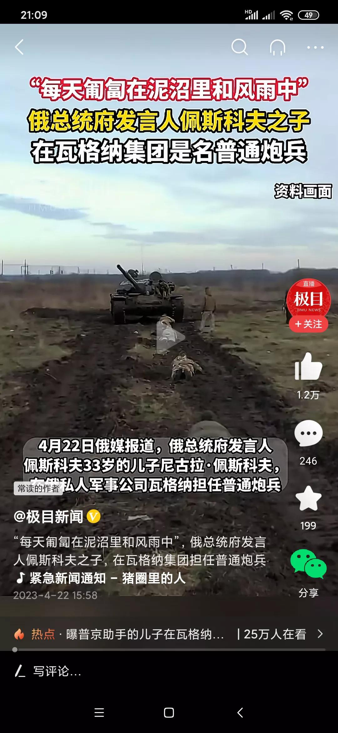 只凭一句话,原地自嗨到了爽点! 瓦格纳老板普里戈津仅仅说了一句话:佩斯科夫儿子是瓦格纳炮兵,这一下子就捅到了爽点上了。有人说,绍伊古应该学学佩斯科夫,血性点,也派儿子上战场!可是人家只有一个女儿,再努力也没用啊。还有人说:乌拉,俄罗斯领导干部这么有血性,俄罗斯必胜!真不知道兴奋个什么劲,普里戈津就是随口一说而已,照片视频啥都没有,就信了? 佩老爷子的理查德米勒,有图有视频,还不少人质疑是伪造的呢,就凭普里戈津一句话就兴奋了,这也太敏感了吧!