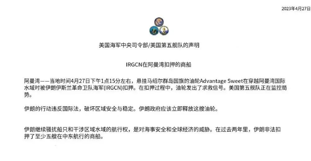 伊朗扣押美国油轮!伊朗没有航母和大驱,伊朗只有导弹快艇,但伊朗敢出手。 美国海军中央司令部第五舰队发表声明称,伊朗伊斯兰革命卫队在阿曼湾扣押了一艘油轮,美军指控这一行动违反国际法,要求伊朗当局立即释放这艘油轮。 美国明目张胆的抢盗他国石油,这时候喊起国际法来,[我想静静][我想静静][我想静静]从美国人口中说出违反国际法怎么感到好笑呢?[汗][汗][汗][汗] 伊朗够刚!第一次听到美国"控诉"这种行为。以前都是别国遭到欺压时控诉,如今终于反转了。可见就是个纸老虎,怕不要命的。