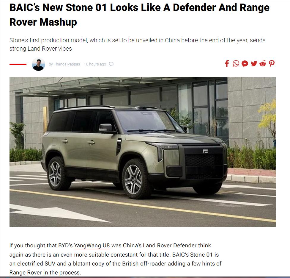 外媒关注到石头01了!看看他们怎么说 近日,极石品牌首款车型石头01申报图曝光,引起了网络热议,硬派的外观设计酷似路虎卫士。在国内引起热议的同时,居然被国外汽车媒体Carscoops知晓了,并且外媒编辑专门发了一篇文章表示北汽全新石头01看起来像卫士和路虎揽胜的混搭,英文原文标题《BAIC’s New Stone 01 Looks Like A Defender And Range Rover Mashup》。副标题:极石首款量产车型年底前登陆中国 路虎风范十足,《Stone's first production model, which is set to be unveiled in China before the end of the year, sends strong Land Rover vibes》。 文章还说,如果你认为比亚迪仰望U8是中国版路虎卫士,那么你再看看,因为有一个更适合这个头衔的竞争者。BAIC的Stone 01是一款电动SUV,是对英国越野车的公然抄袭(翻版),并在此过程中增加了一些揽胜的痕迹。原文:If you thought that BYD’s YangWang U8 was China’s Land Rover Defender think again as there is an even more suitable contestant for that title. BAIC’s Stone 01 is an electrified SUV and a blatant copy of the British off-roader adding a few hints of Range Rover in the process. 以上内容摘自Carscoops网站的文章,无个人观点。原文链接就不放了,头条规则不让。大家可以自己去找来看看。