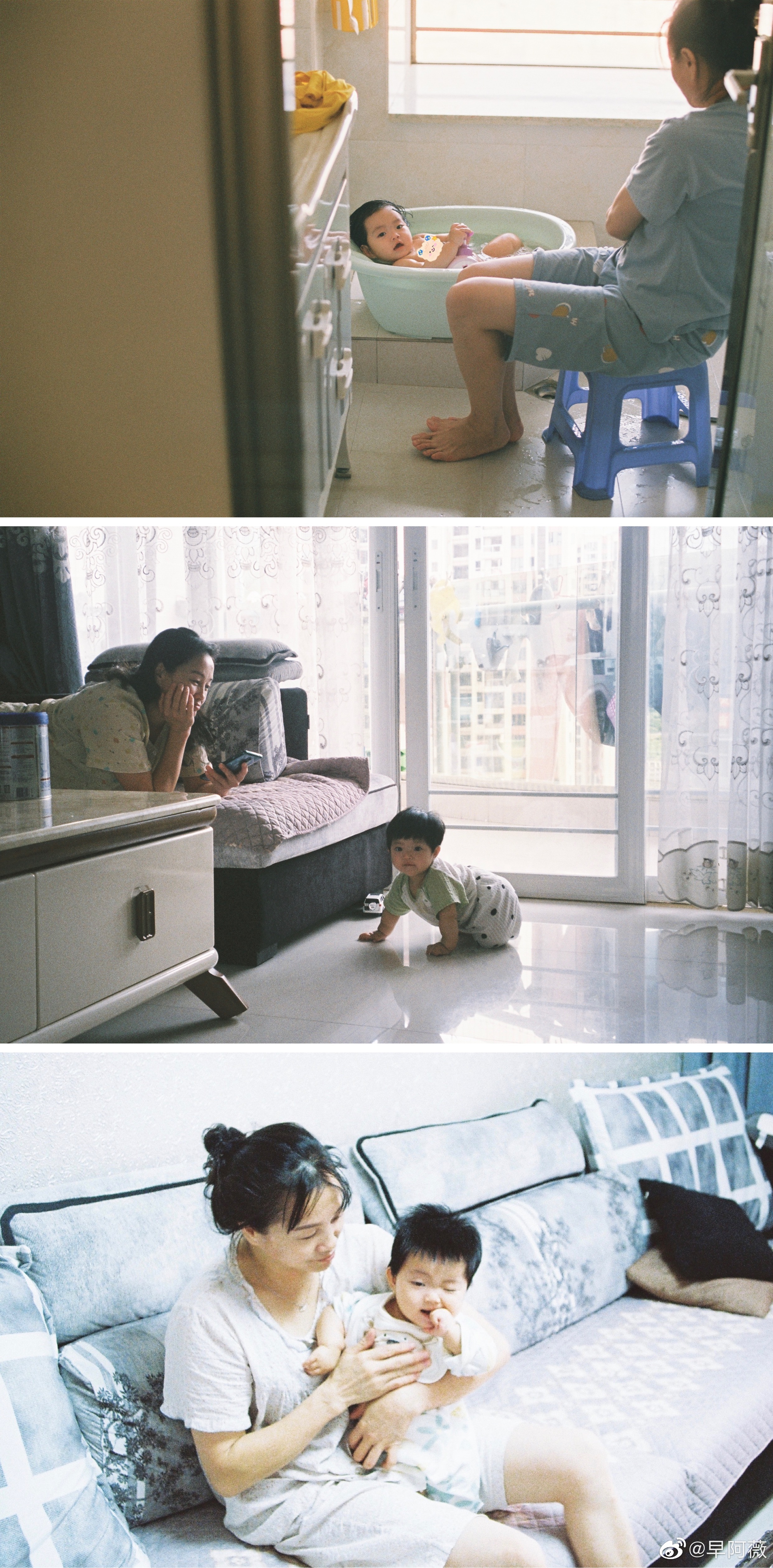 以前拍我妈,会在风和日丽的时候,在旅游的时候,在妈妈穿了漂亮裙子的时候。我女儿出生后,妈妈心疼我辛苦一直全力帮我。于是我取景器里的妈妈,成了她穿着家居服一点一滴带大我女儿的样子。