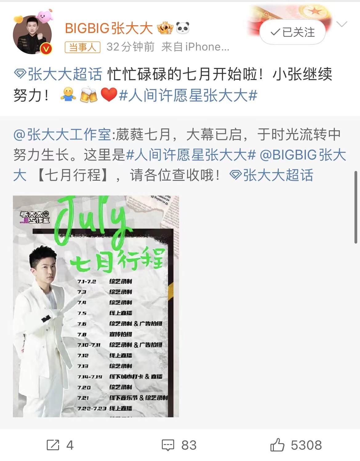 #张大大七月行程# 张大大7月份的行程真的是很充实呀!不仅要去突袭好友的演唱会,而且还要去新疆打卡,真的是让人羡慕不已!虽然忙了点,但是张大大的生活是我的梦啊! #张大大七月好忙#
