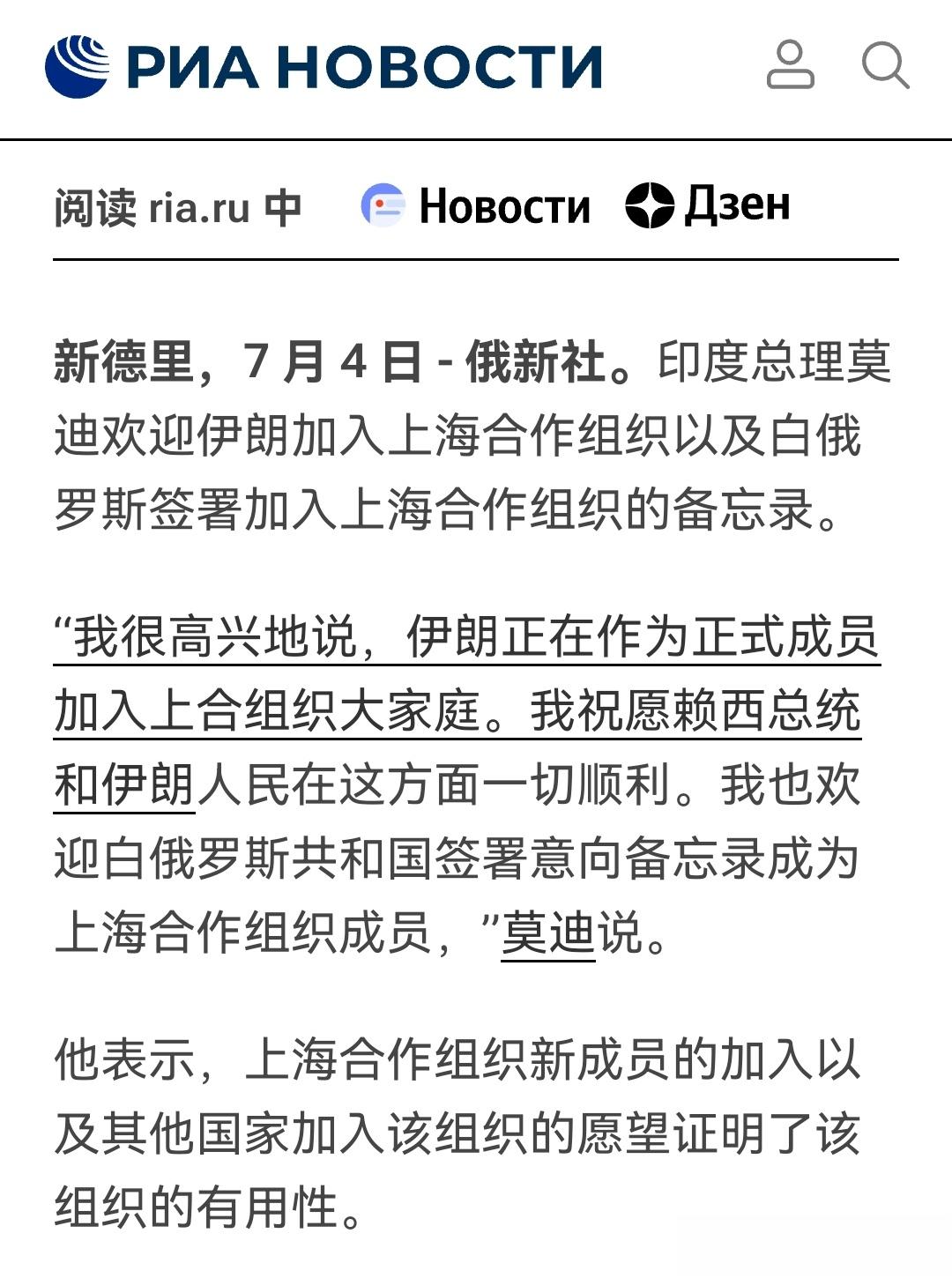 印度总理莫迪欢迎伊朗加入上合组织,也欢迎白俄罗斯签署加入上合的意向备忘录