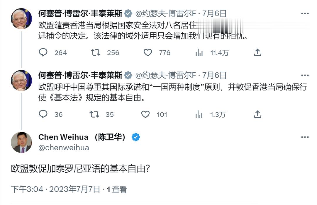 中国香港警方通缉8名外逃的乱港分子,欧盟外交与安全政策高级代表何塞普·博雷尔(就是前几天说访华又突然被中方取消行程的那个)在推特上对港府的决定表示“谴责”。