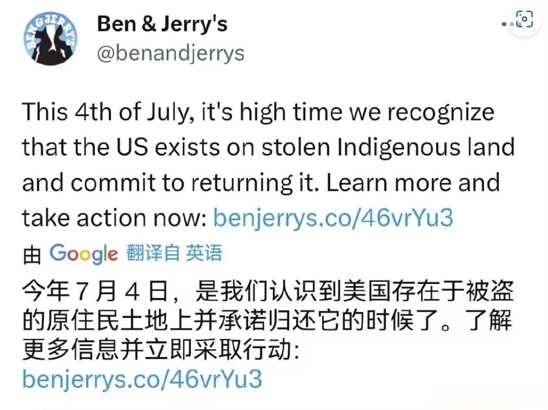 同样是这个品牌,在7月4日独立日时,说美国是靠窃取原住民的土地,应该把地还给原住民。