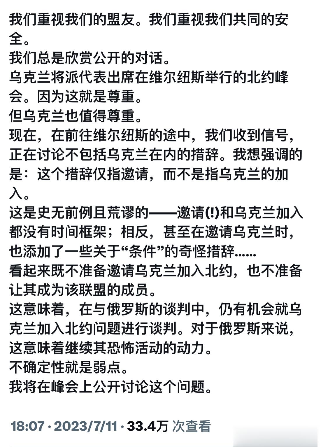 推特内容大意就是说,泽连斯基在去维尔纽斯参加北约峰会的路上,听说北约居然在乌克兰不在场的情况下讨论是否邀请乌克兰加入北约,而且邀请乌克兰入盟的时间表也没有,甚至还有“模糊的条件”,泽连斯基痛批这是“荒谬的”,并质问这是不是不准备邀请乌克兰加入了?