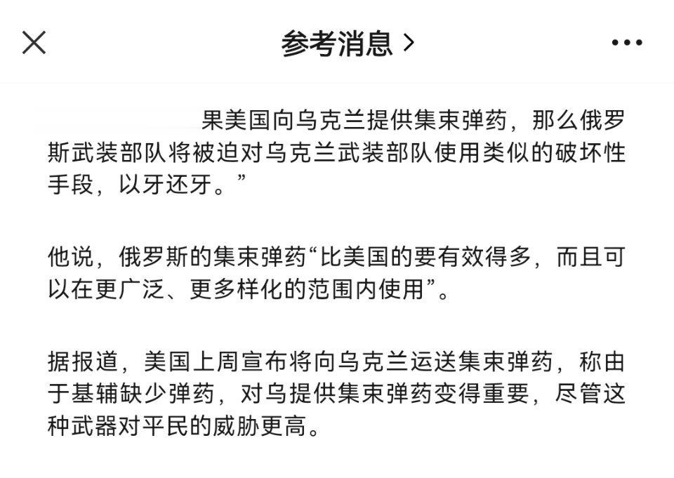 绍伊古说:“一旦美国向乌克兰提供集束弹药,作为回应,俄罗斯武装部队将被迫对乌克兰武装部队使用类似武器。”他还表示,俄方也拥有集束弹药,它们比美国的集束弹药“更有效”。