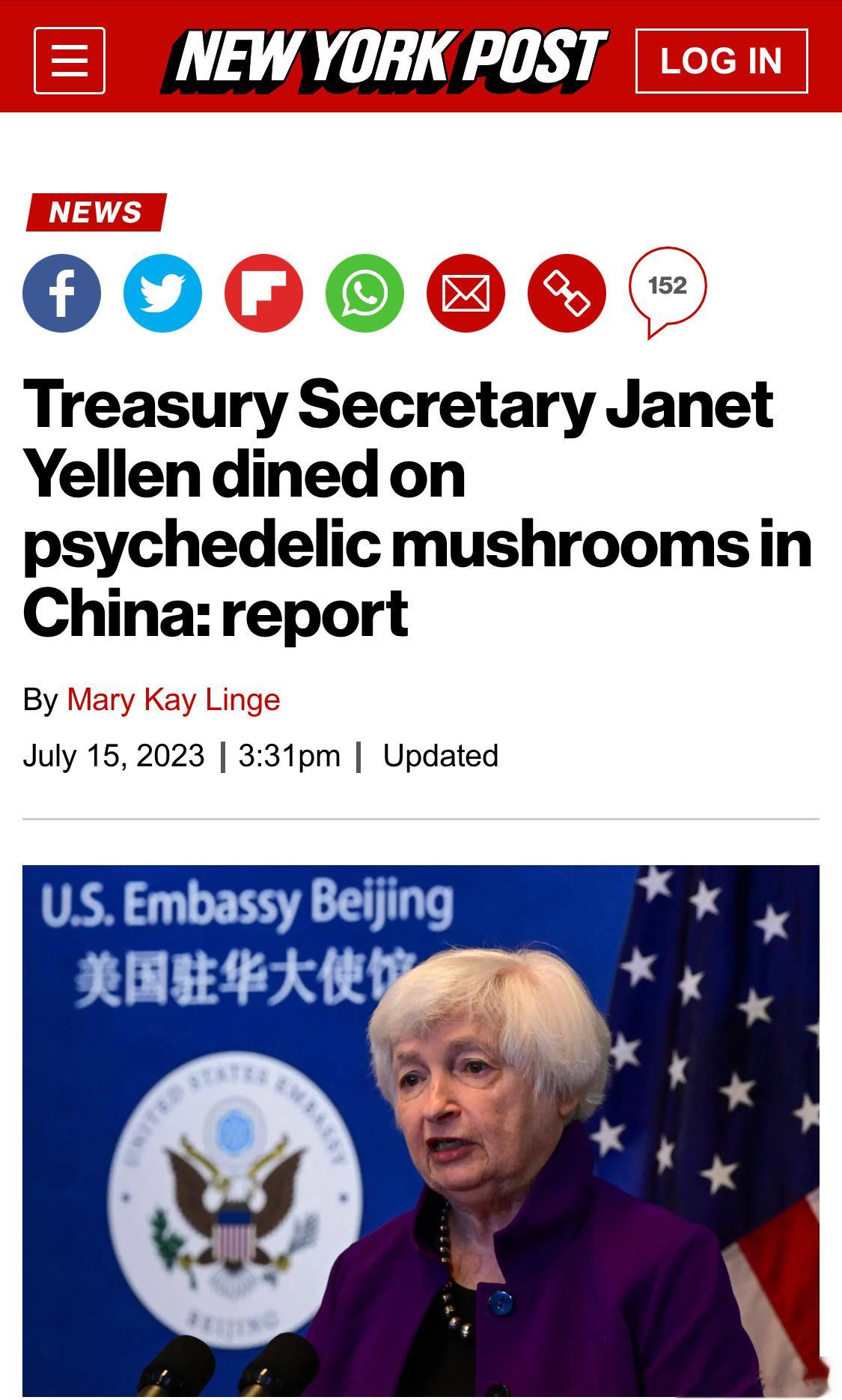 纽约邮报标题:《美国财长耶伦在中国吃致幻蘑菇》(图2)