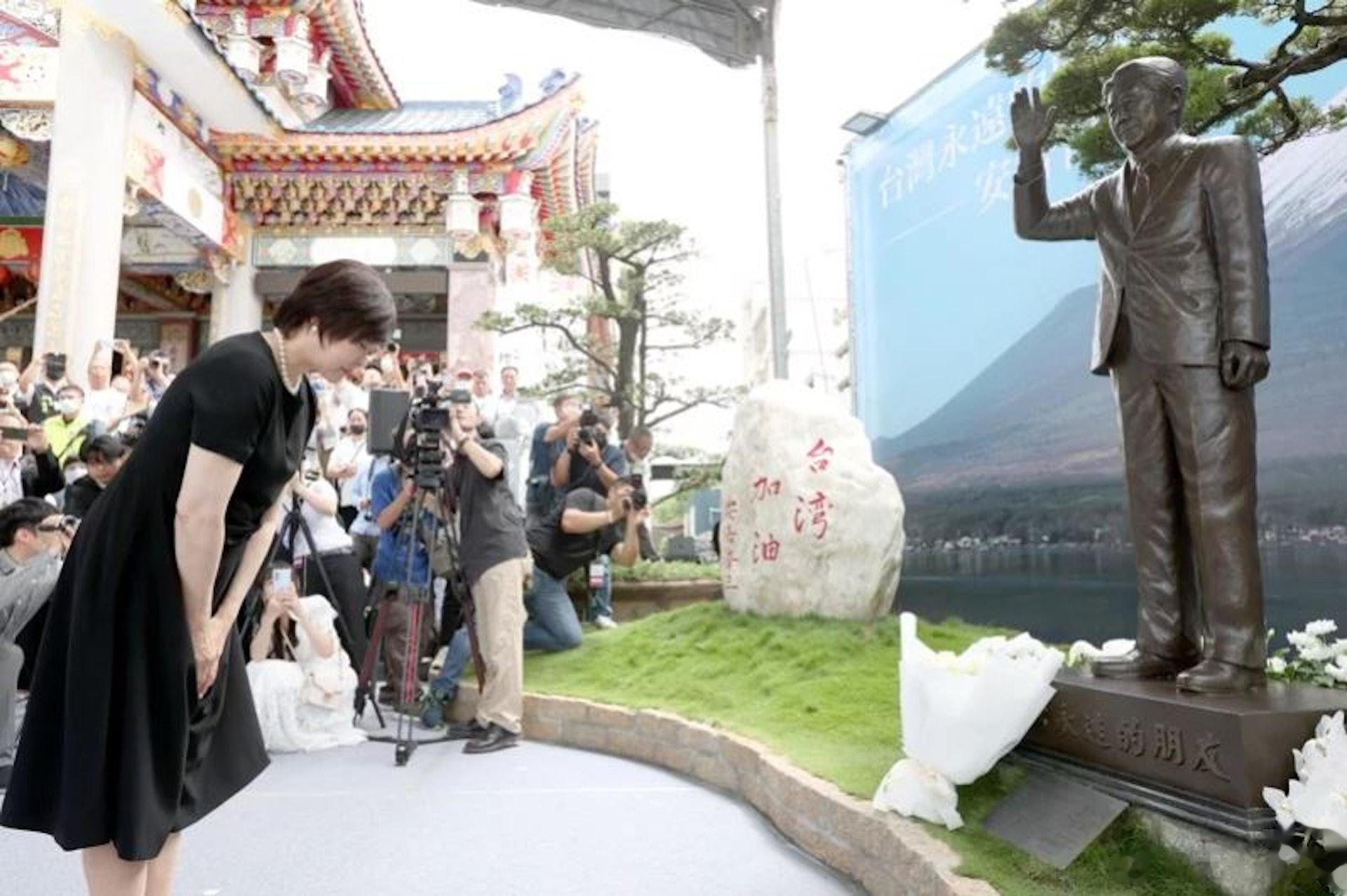 日本已死前首相安倍晋三的遗孀安倍昭惠,昨天跑到台湾省,在高雄保安堂向台湾皇民给安倍晋三立的铜像献花,其间还哽咽表示“相信丈夫的灵魂也会一起来到这里,且今后也会在某处为‘台日友好’而努力。”(所以你们的“台日友好”是在阴间是吧?)