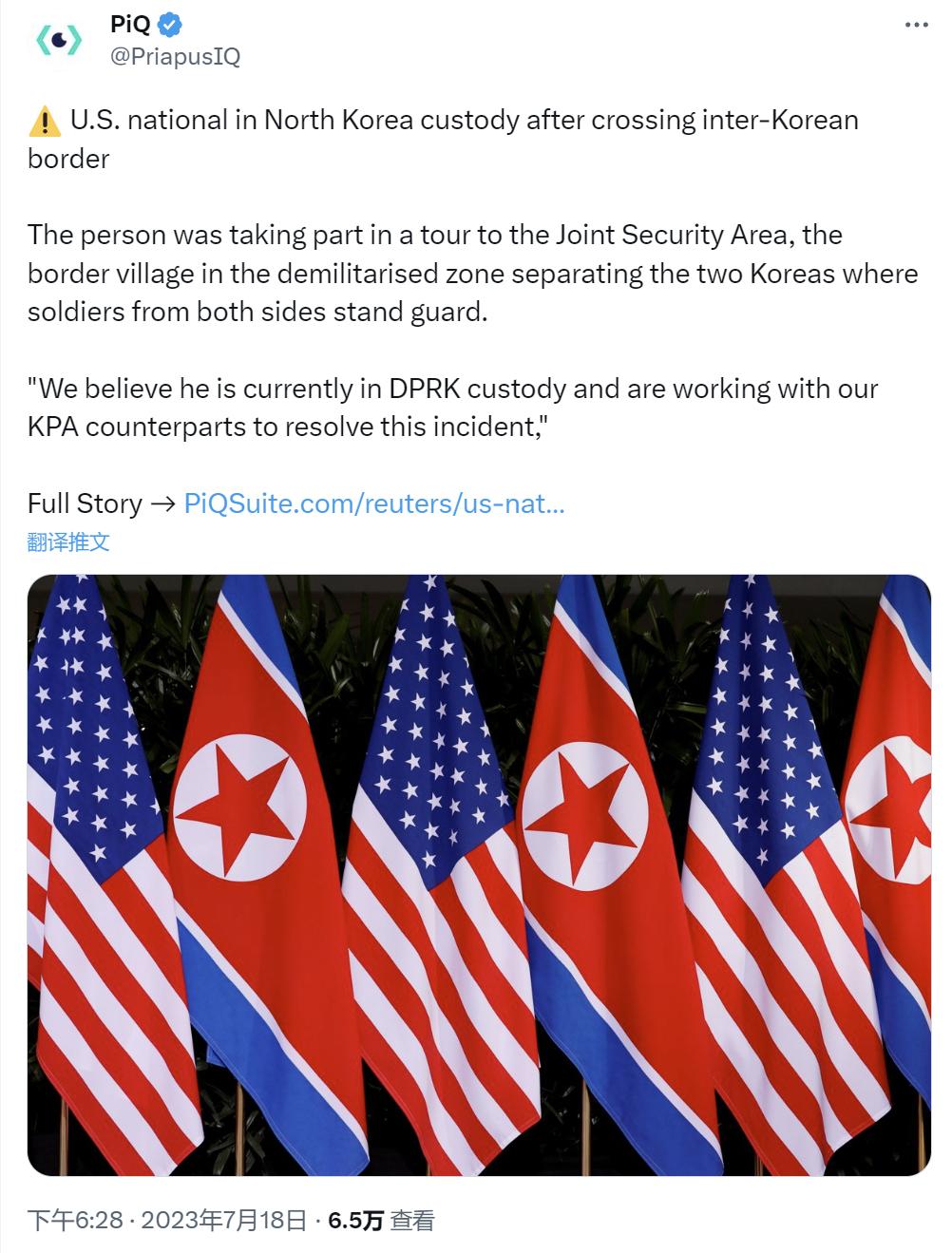 突发,一名美国士兵在未经批准的旅行中越过朝韩边境后,被朝鲜方面拘留。