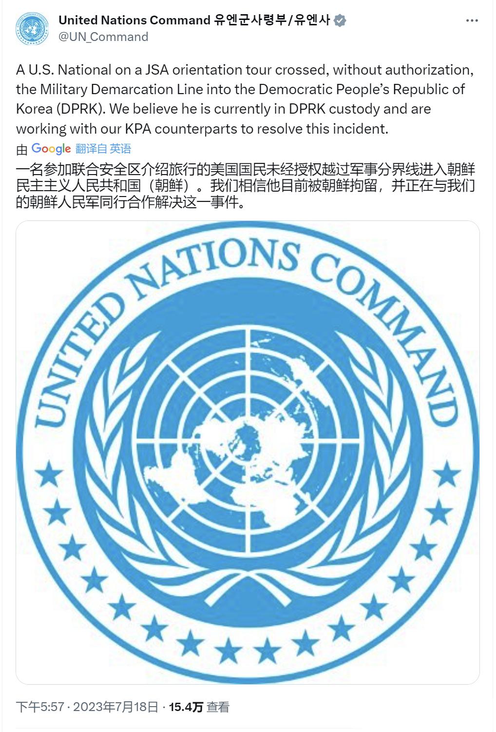 “联合国军司令部”的推特(图3)表示,目前他们正与朝鲜人民军解决这一事件。