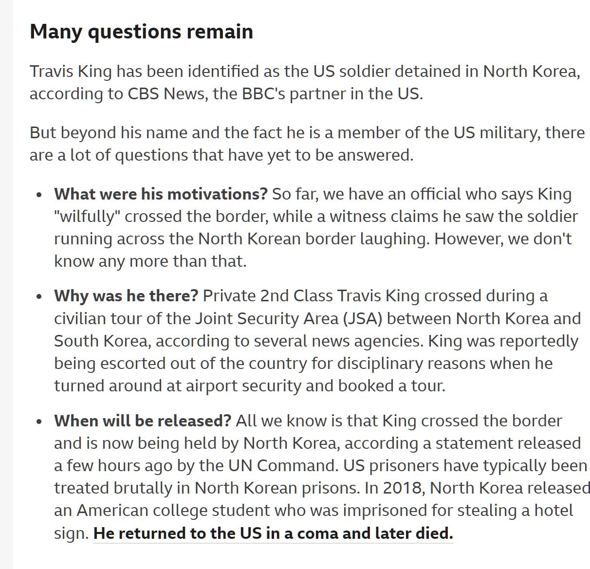 现在BBC等媒体已经在说他是“故意”越境去朝鲜的了。