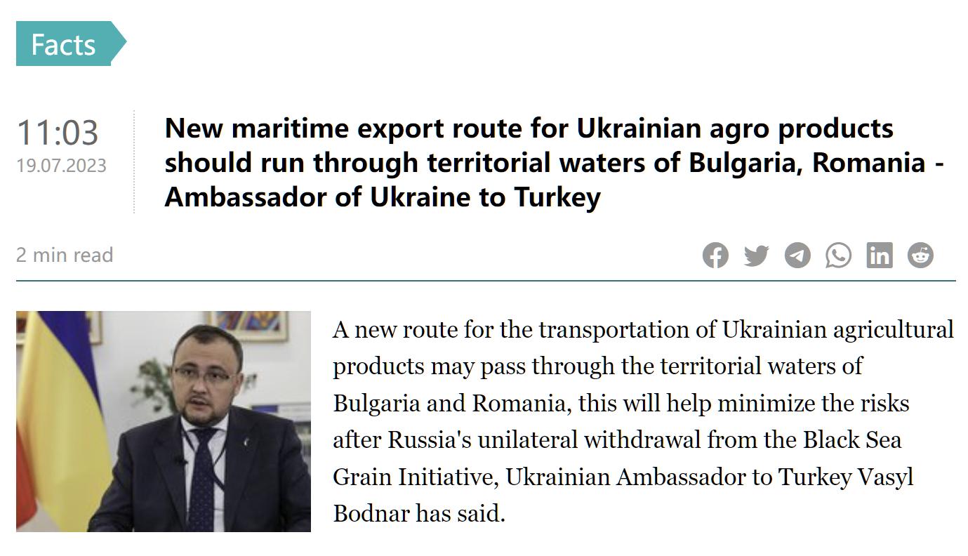 乌克兰驻土耳其大使瓦西里·邦达尔(Vasyl Bondar)表示,他们现在希望与保加利亚和罗马尼亚达成某种协议,允许乌克兰商船使用其领海,以便为粮食出口创造一条“安全航道”。