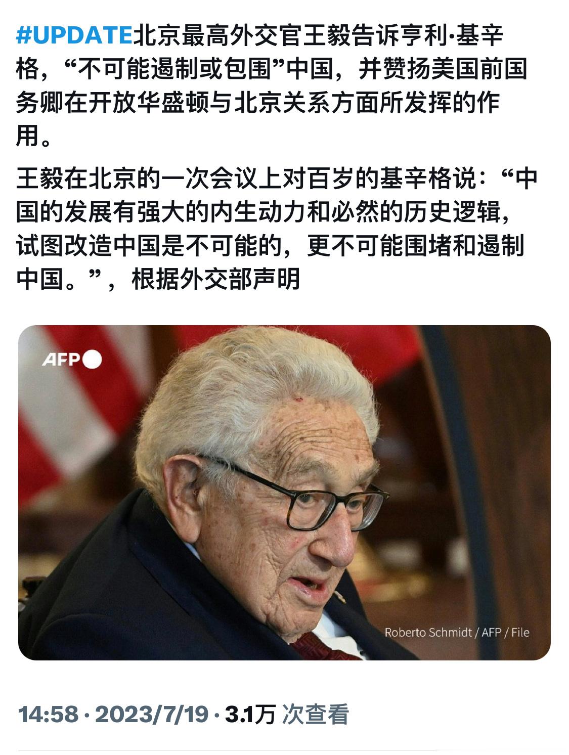 法新社的报道#基辛格100岁还能飞来北京出差#