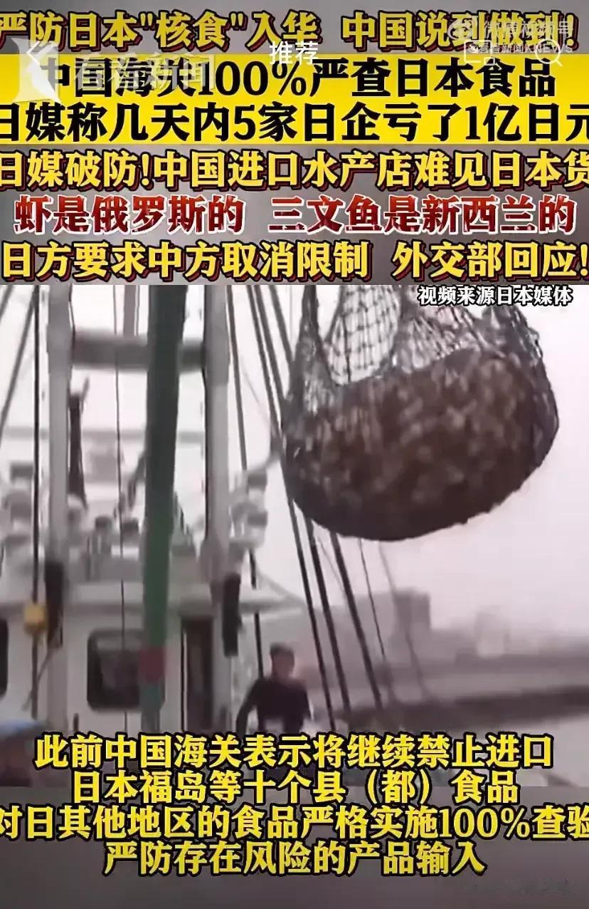日媒报道称,中方宣布对日本食品100%严查后,几天内已有5家日企亏损1亿日元。日