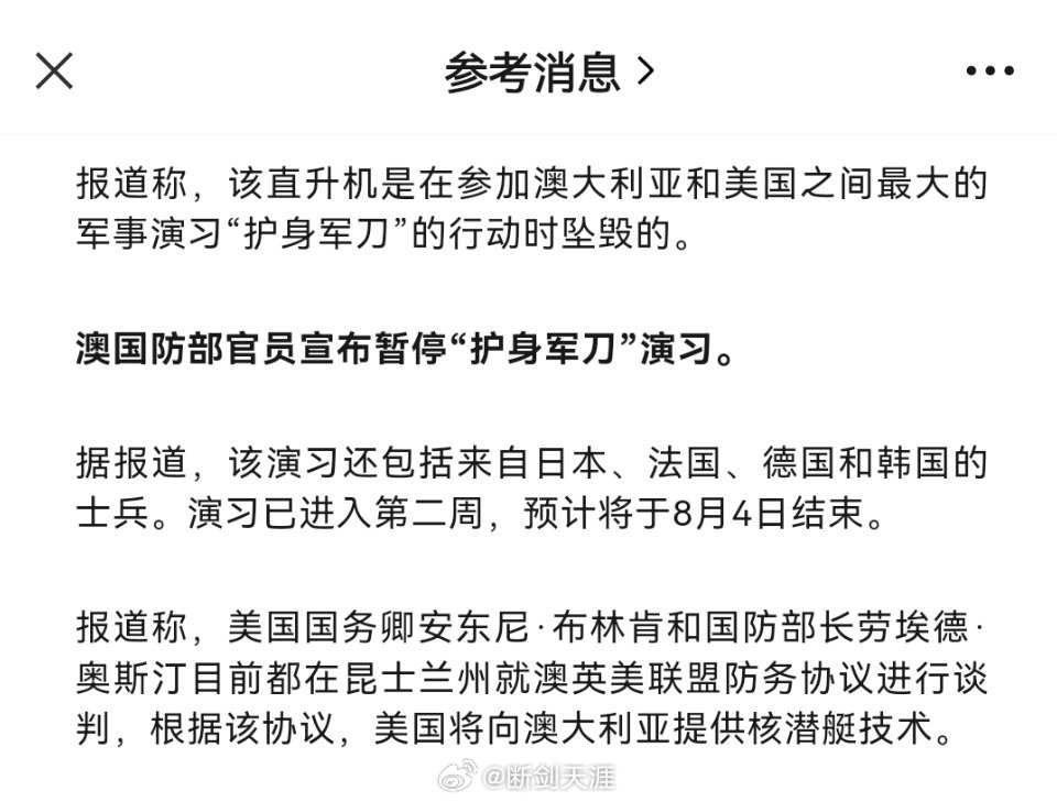 他说,一架MRH-90“泰斑蛇”直升机于当地时间晚上10点30分左右坠毁。马尔斯在29日上午的新闻发布会上说:“四名机组人员尚未找到。”他说:“现在还处于初期阶段,后面还会提供关于这一事件的更多信息。”报道称,该直升机是在参加澳大利亚和美国之间最大的军事演习“护身军刀”的行动时坠毁的。(参考消息)