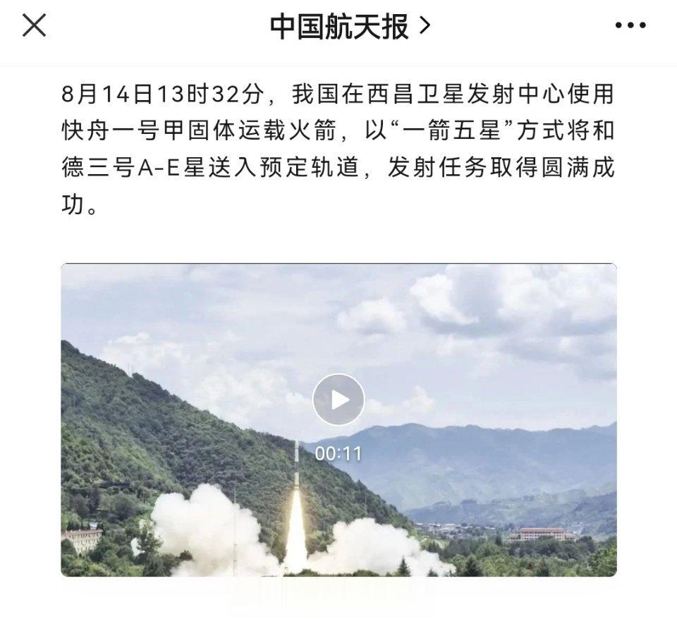 一箭五星!快舟一号甲火箭成功发射和德三号A-E星。