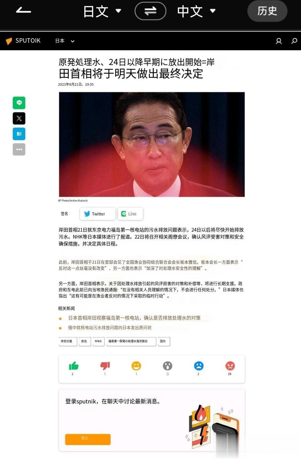 日本首相岸田文雄做出最终决定:核电站处理水24日以后开始尽早排放(俄罗斯卫星通讯社消息——国际日文版)