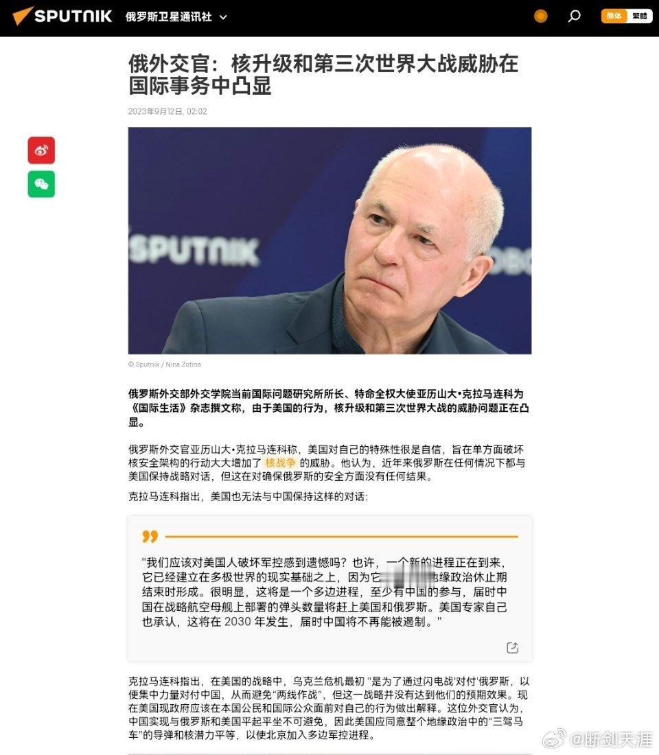 俄罗斯外交部外交学院当前国际问题研究所所长、特命全权大使亚历山大•克拉马连科为《国际生活》杂志撰文称,由于美国的行为,核升级和第三次世界大战的威胁问题正在凸显。