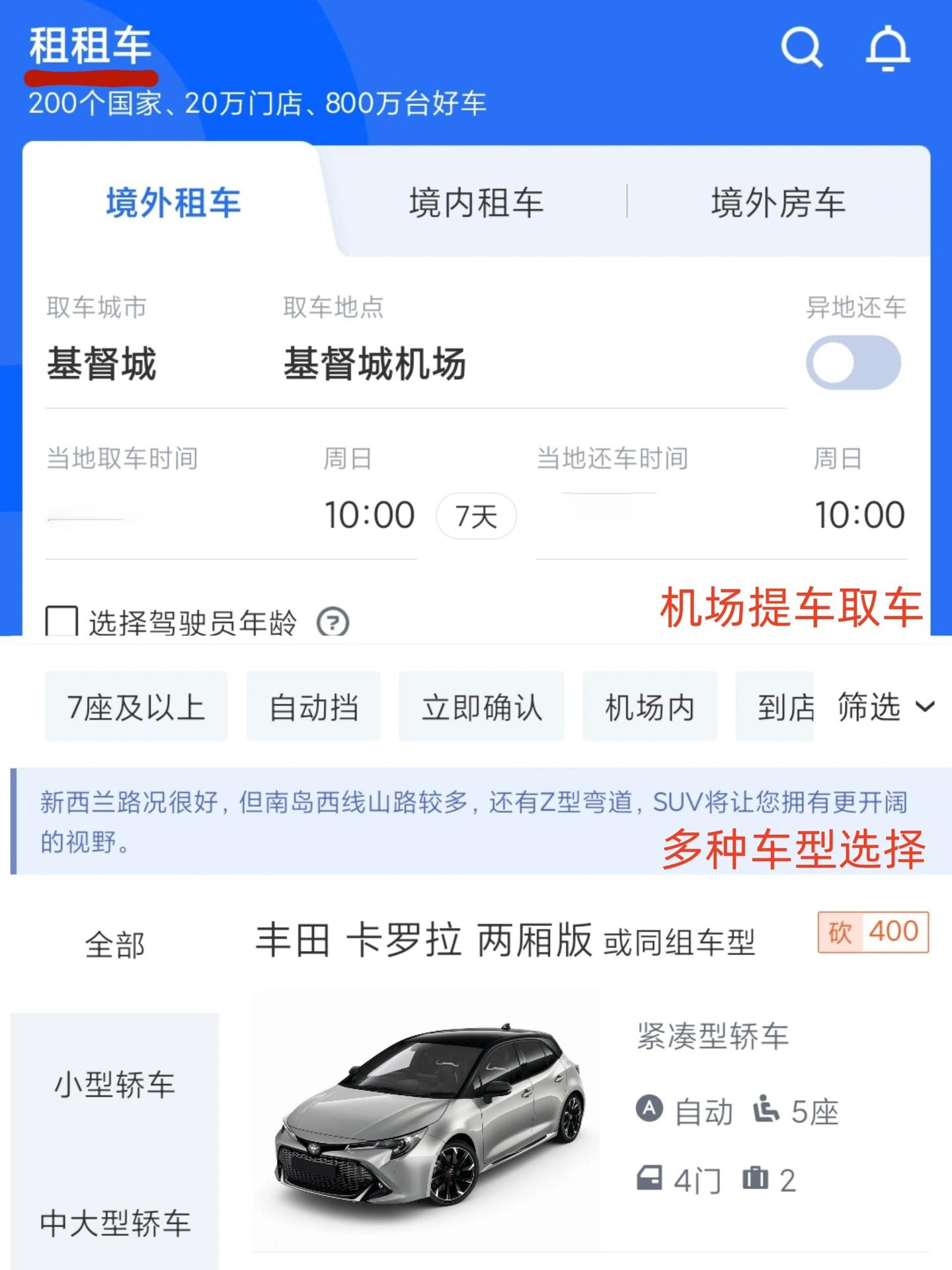 🌼租车:出发前提前在租租车上book好车,到达基督城机场就可以直接提车,还有24h中英文客服即时帮忙解决问题!