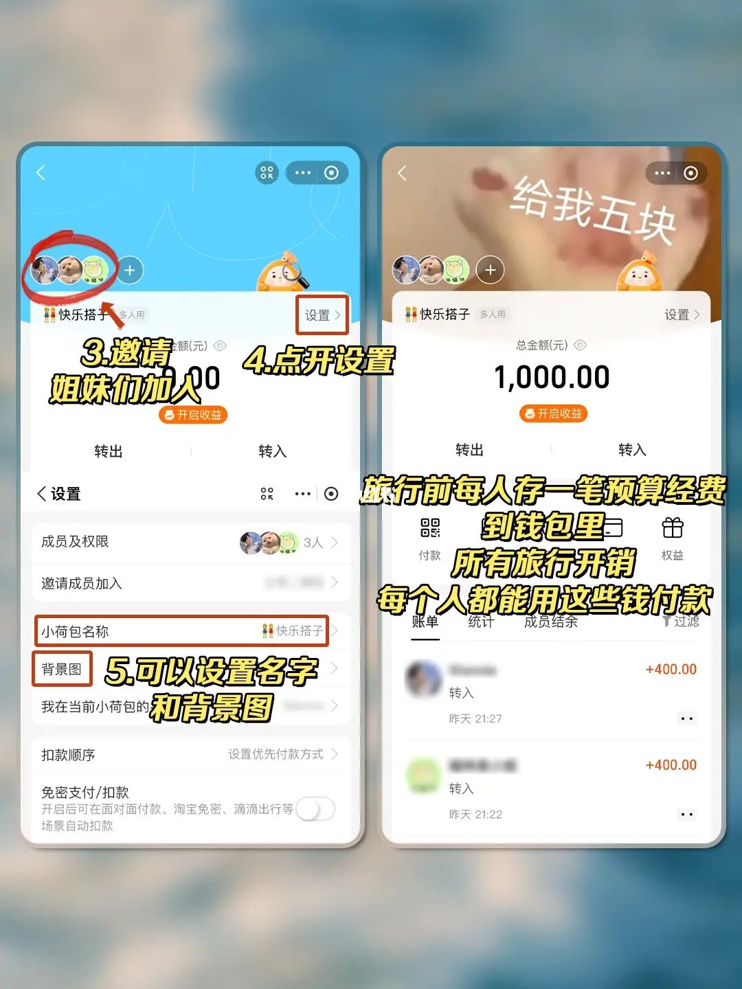 [种草R]在旅行前,一人存一笔预算💰到小荷包里,之后每笔旅行💰都可以用这个小荷包直接付,并且是每个成员都能直接付哦~像机票酒店这种多的支出,就不用一个人垫💰啦!