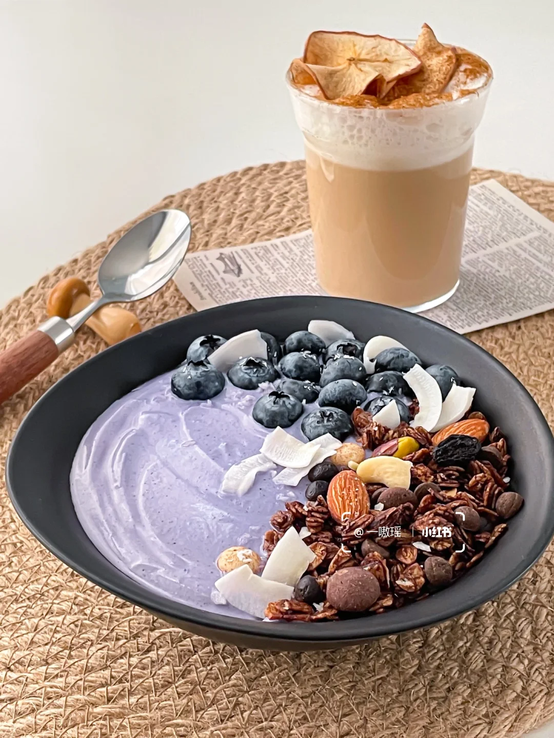 📢分享清肠胃又能抗炎的酸奶碗 〰️ 👩🏻🍳做法 ❶希腊酸奶加巴西莓粉搅匀(一点蝶豆花调色) ❷燕麦垫底,铺上蓝紫色酸奶 ❸再倒上烘焙燕麦片、黑巧、蓝莓、椰子片、坚果 〰️ 📣【本餐抗炎选手集合】 希腊酸奶 燕麦 蓝莓 黑巧 BM均衡大师巴西莓粉&肉桂粉 🔵两分钟就搞定,赶快试试 可以直接用希腊酸奶做,也可用普通厚酸奶过滤成希腊酸奶,比普通酸奶蛋白质含量更高,饱腹感更强,不易暴食 真冻干巴西莓粉不能完全溶解,味道也很清淡适口 🍎苹果肉桂热拿铁香醇浓郁,好适合刚刚降温的秋天🍂 太舒服啦😌
