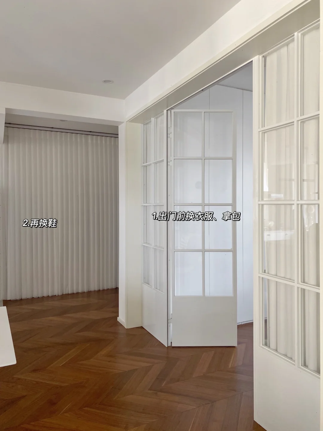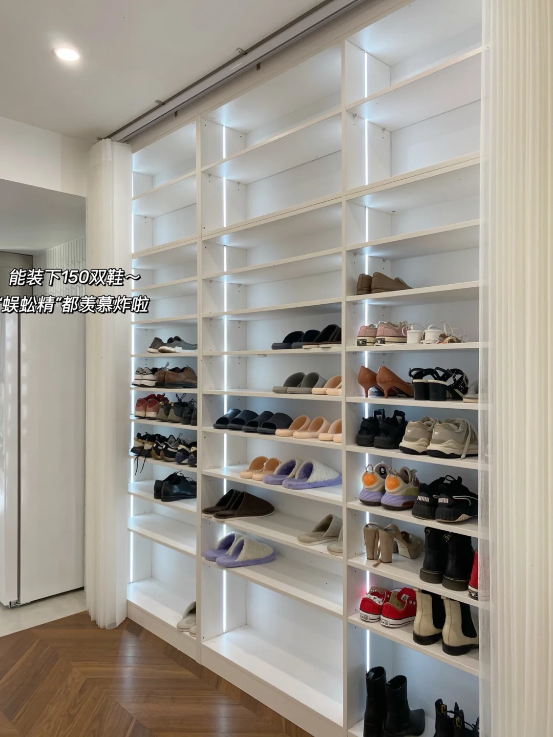4⃣️鞋柜柜门换成梦幻帘,不但找鞋更方便,还防止家属每次换完鞋忘关柜门,梦幻帘给人感觉后面还有一个窗户没那么压抑