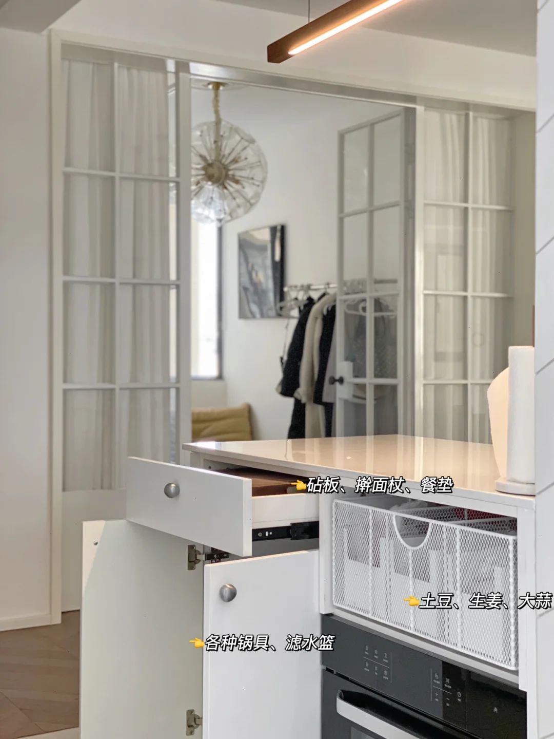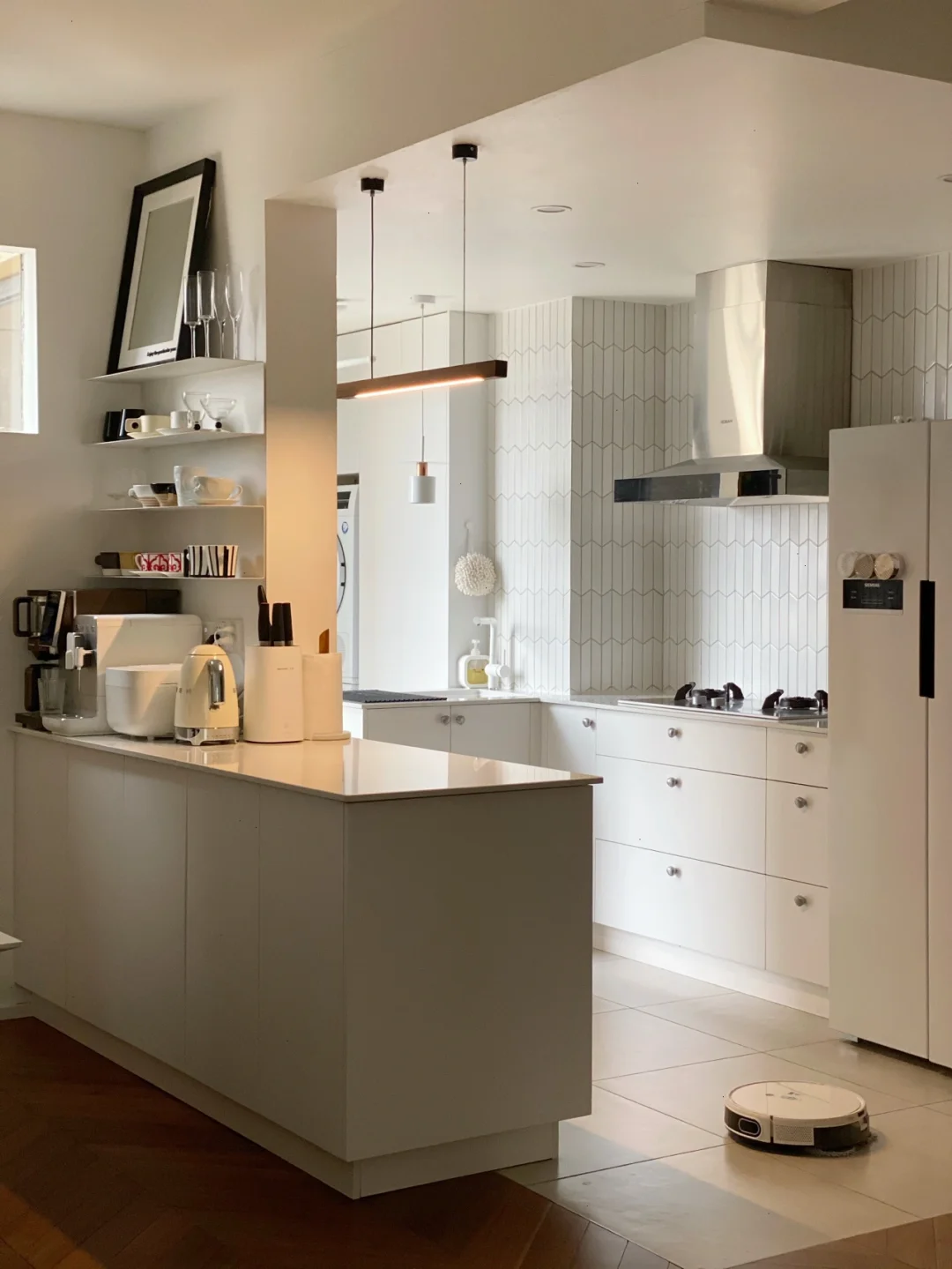 8⃣️厨房做2✖️0.6m吧台,既收纳了各种厨房小电器、锅具、蒸烤箱、不能放冰箱的蔬菜……还能当做水吧,另外大面积的台面切菜、做面食都很方便,超市采购回来也是放在吧台上,然后分类收纳